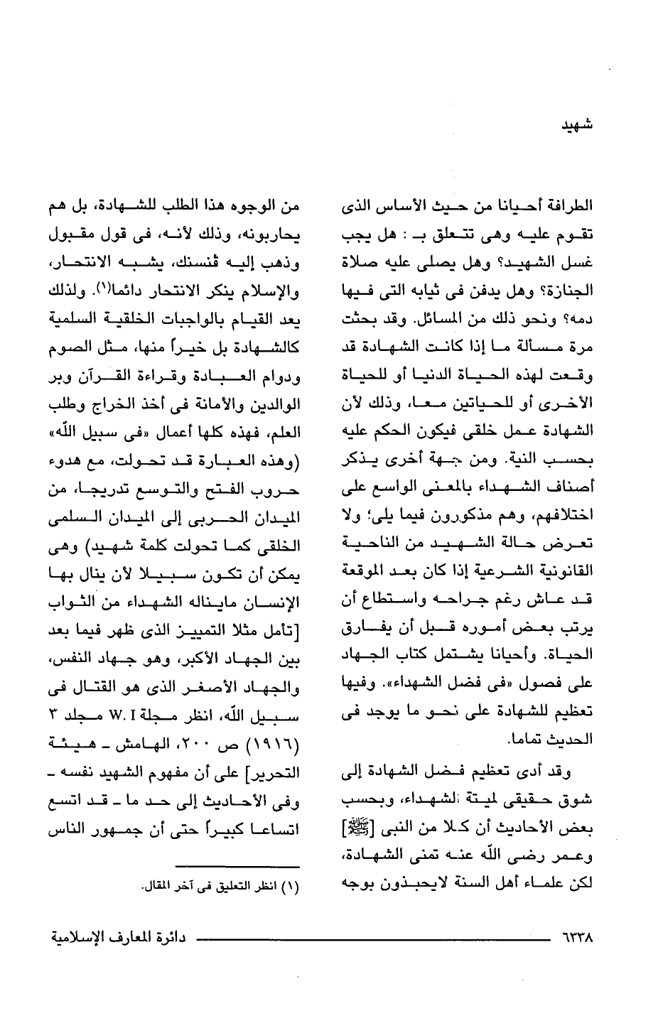 وقد أدى تعظيم فضل الشهادة إلى شوق حقيقى لميتة الشهداء، وبحسب بعض الأحاديث أن كلا من النبى [-صلى اللَّه عليه وسلم-] وعمر رضى اللَّه عنه تمنى الشهادة، لكن علماء أهل السنة لا يحبذون بوجه من الوجوه هذا الطلب للشهادة، بل هم يحاربونه، وذلك لأنه، فى قول مقبول وذهب إليه فنسنك، يشبه الانتحار، والإسلام ينكر الانتحار دائما (¬1). ولذلك يعد القيام بالواجبات الخلقية السلمية كالشهادة بل خير، منها، مثل الصوم ودوام العبادة وقراءة القرآن وبر الوالدين والأمانة فى أخذ الخراج وطلب العلم، فهذه كلها أعمال "فى سبيل اللَّه" (وهذه العبارة قد تحولت، مع هدوء حروب الفتح والتوسع تدريجا، من الميدان الحربى إلى الميدان السلمى الخلقى كما تحولت كلمة شهيد) وهى يمكن أن تكون سبيلا لأن ينال بها الإنسان ما يناله الشهداء من الثواب [تأمل مثلا التمييز الذى ظهر فيما بعد بين الجهاد الأكبر، وهو جهاد النفس، والجهاد الأصغر الذى هو القتال فى سبيل اللَّه، انظر مجلة W.I مجلد 3 (1916) ص 200، الهامش - هيئة التحرير] على أن مفهوم الشهيد نفسه -وفى الأحاديث إلى حد ما- قد اتسع اتساعًا كبيرًا، حتى أن جمهور الناس