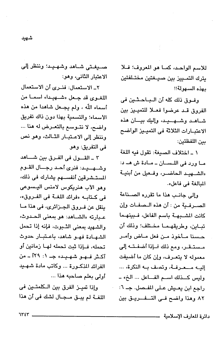 3 - القول فى الفرق بين شاهد وشهيد: فنرى أحد رجال القوم المستشرقين أنفسهم يشارك فى ذلك، وهو الأب هنريكوس لامنس اليسوعى فى كتابه "فرائد اللغة فى الفروق"، ينقل عن فروق الجزائرى، فى هذا ما عبارته "الشاهد: هو بمعنى الحدوث، والشهيد بمعنى الثبوت، فإنه إذا تحمل الشهادة فهو شاهد، باعتبار حدوث تحمله، فإذا ثبت تحمله لها زمانين أو أكثر فهو شهيد" جـ 1: 29 أ - من الفرائد المذكورة. . . وكاتب مادة شهيد أولى بعلم صاحبه هذا. . .