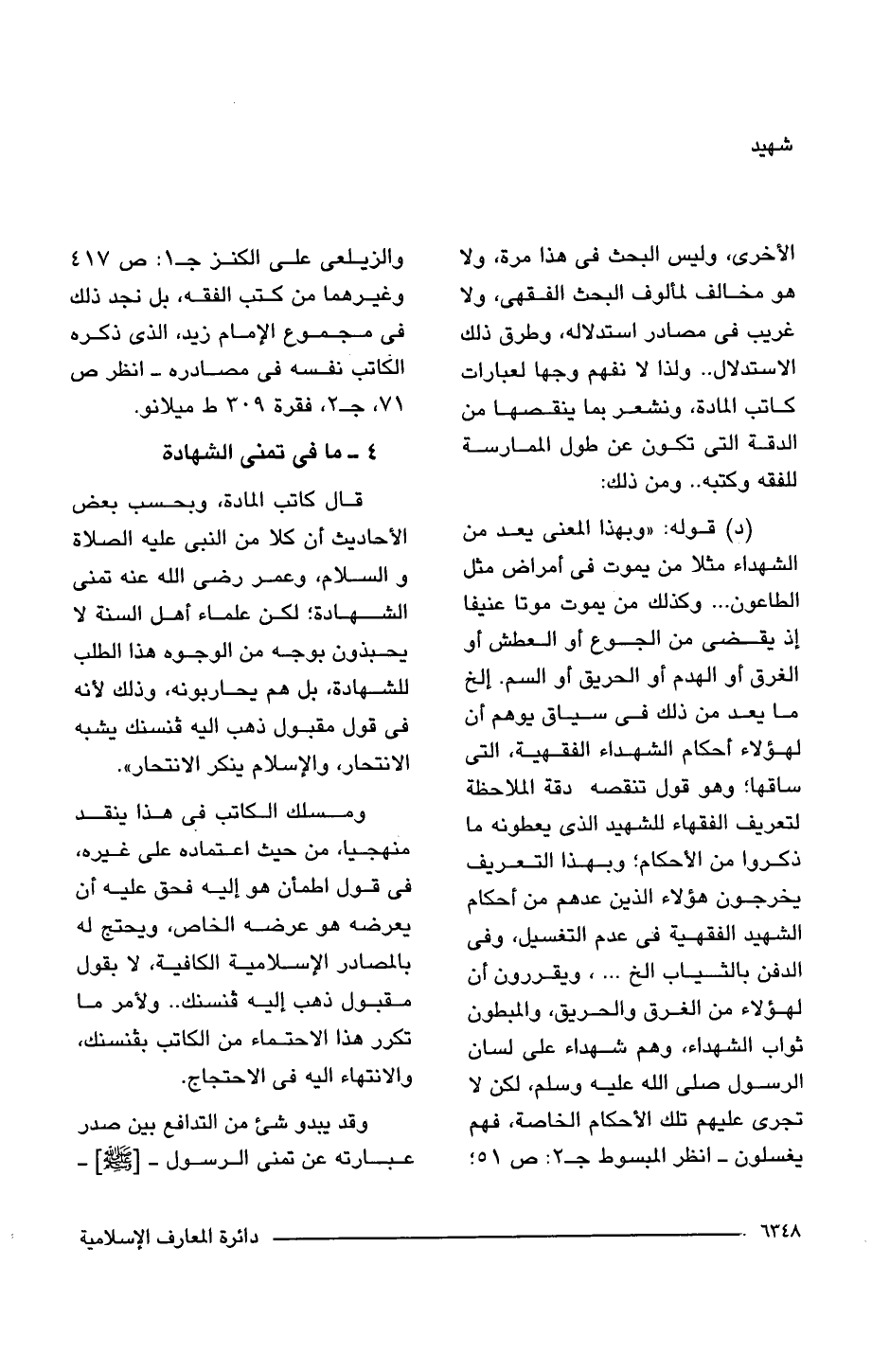 قال كاتب المادة، وبحسب بعض الأحاديث أن كلا من النبى عليه الصلاة والسلام، وعمر رضى اللَّه عنه تمنى الشهادة؛ لكن علماء أهل السنة لا يحبذون بوجه من الوجوه هذا الطلب للشهادة، بل هم يحاربونه، وذلك لأنه فى قول مقبول ذهب اليه فنسنك يشبه الانتحار، والإسلام ينكر الانتحار".