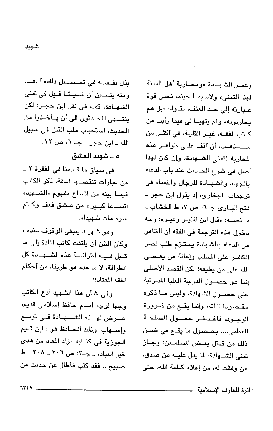 وعمر الشهادة "ومحاربة أهل السنة لهذا التمنى" ولاسيما حينما نحس قوة عبارته إلى حد العنف، بقوله "بل هم يحاربونه" ولم يتهيأ لى فيما رأيت من كتب الفقه، غير القليلة، فى أكثر من مذهب، أن أقف على ظواهر هذه المحاربة لتمنى الشهادة، وإن كان لهذا أصل فى شرح الحديث عند باب الدعاء بالجهاد والشهادة للرجال والنساء فى ترجمات البخارى، إذ يقول ابن حجر -فتح البارى جـ 6، ص 7، ط الخشاب- ما نصه: "قال ابن المنير وغيره: وجه دخول هذه الترجمة فى الفقه أن الظاهر من الدعاء بالشهادة يستلزم طلب نصر الكافر على المسلم، وإعانة من يعصى اللَّه على من يطيعه؛ لكن القصد الأصلى إنما هو حصول الدرجة العليا المترتبة على حصول الشهادة، وليس ما ذكره مقصودا لذاته، وإنما يقع من ضرورة الوجود، فاغتفر حصول المصلحة العظمى. . . بحصول ما يقع فى ضمن ذلك من قتل بعض المسلمين؛ وجاز تمنى الشهادة، لما يدل عليه من صدق، من وفقت له، من إعلاء كلمة اللَّه، حتى بذل نفسه فى تحصيل ذلك" أ. هـ. ومنه يتبين أن شيئا قيل فى تمنى الشهادة، كما فى نقل ابن حجر؛ لكن ينتهى المحدثون إلى أن يأخذوا من الحديث، استحباب طلب القتل فى سبيل اللَّه -ابن حجر- جـ 6، ص 12.