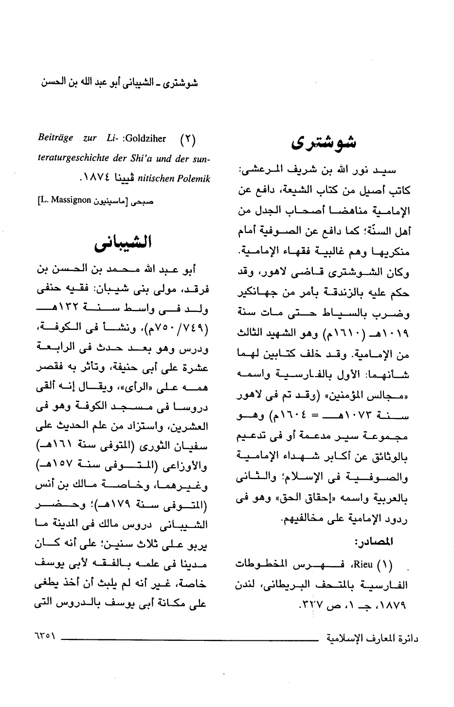 سيد نور اللَّه بن شريف المرعشى: كاتب أصيل من كتاب الشيعة، دافع عن الإمامية مناهضا أصحاب الجدل من أهل السنّة؛ كما دافع عن الصوفية أمام منكريها وهم غالبية فقهاء الإمامية. وكان الشوشترى قاضى لاهور، وقد حكم عليه بالزندقة بأمر من جهانكير وضرب بالسياط حتى مات سنة 1019 هـ (1610 م) وهو الشهيد الثالث من الإمامية. وقد خلف كتابين لهما شأنهما: الأول بالفارسية واسمه "مجالس المؤمنين" (وقد تم فى لاهور سنة 1073 هـ = 1604 م) وهو مجموعة سير مدعمة أو فى تدعيم بالوثائق عن أكابر شهداء الإمامية والصوفية فى الإسلام؛ والثانى بالعربية واسمه "إحقاق الحق" وهو فى ردود الإمامية على مخالفيهم.