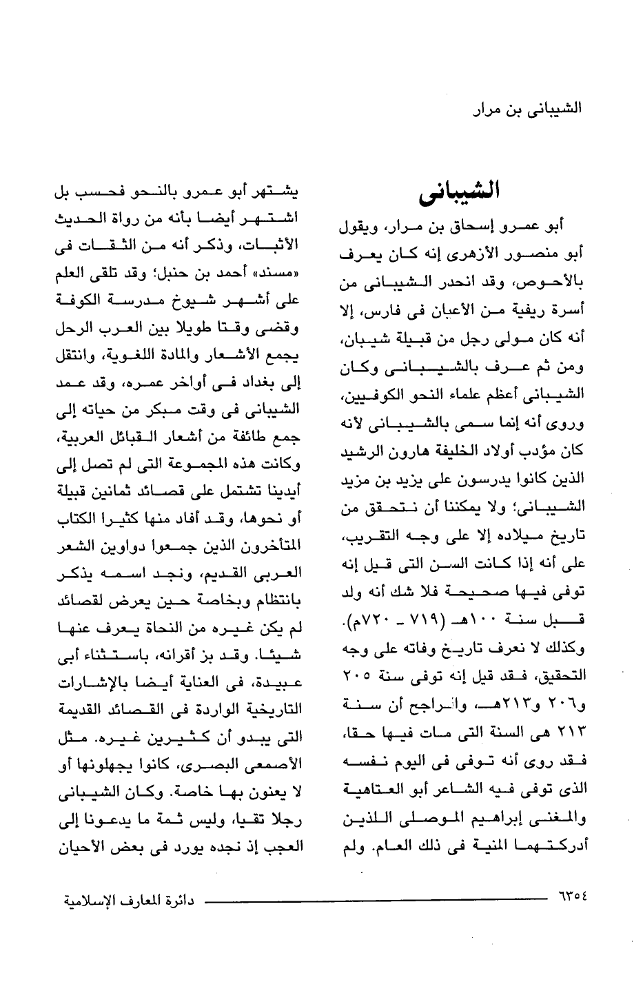 أبو عمرو إسحاق بن مرار، ويقول أبو منصور الأزهرى إنه كان يعرف بالأحوص، وقد انحدر الشيبانى من أسرة ريفية من الأعيان فى فارس، إلا أنه كان مولى رجل من قبيلة شيبان، ومن ثم عرف بالشيبانى وكان الشيبانى أعظم علماء النحو الكوفيين، وروي أنه إنما سمى بالشيبانى لأنه كان مؤدب أولاد الخليفة هارون الرشيد الذين كانوا يدرسون على يزيد بن مزيد الشيبانى؛ ولا يمكننا أن نتحقق من تاريخ ميلاده إلا على وجه التقريب، على أنه إذا كانت السن التى قيل إنه توفى فيها صحيحة فلا شك أنه ولد قبل سنة 100 هـ (719 - 720 م). وكذلك لا نعرف تاريخ وفاته على وجه التحقيق، فقد قيل إنه توفى سنة 205 و 206 و 213 هـ، والراجح أن سنة 213 هى السنة التى مات فيها حقا، فقد روى أنه توفى فى اليوم نفسه الذى توفى فيه الشاعر أبو العتاهية والمغنى إبراهيم الموصلى اللذين أدركتهما المنية فى ذلك العام. ولم يشتهر أبو عمرو بالنحو فحسب بل اشتهر أيضا بأنه من رواة الحديث الأثبات، وذكر أنه من الثقات فى "مسند" أحمد بن حنبل؛ وقد تلقى العلم على أشهر شيوخ مدرسة الكوفة وقضى وقتا طويلا بين العرب الرحل يجمع الأشعار والمادة اللغوية، وانتقل إلى بغداد فى أواخر عمره، وقد عمد الشيبانى فى وقت مبكر من حياته إلى جمع طائفة من أشعار القبائل العربية، وكانت هذه المجموعة التى لم تصل إلى أيدينا تشتمل على قصائد ثمانين قبيلة أو نحوها، وقد أفاد منها كثيرا الكتاب المتأخرون الذين جمعوا دواوين الشعر العربى القديم، ونجد اسمه يذكر بانتظام وبخاصة حين يعرض لقصائد لم يكن غيره من النحاة يعرف عنها شيئا. وقد بز أقرانه، باستثناء أبى عبيدة، فى العناية أيضا بالإشارات التاريخية الواردة فى القصائد القديمة التى يبدو أن كثيرين غيره. مثل الأصمعى البصرى، كانوا يجهلونها أو لا يعنون بها خاصة. وكان الشيبانى رجلا تقيا، وليس ثمة ما يدعونا إلى العجب إذ نجده يورد فى بعض الأحيان