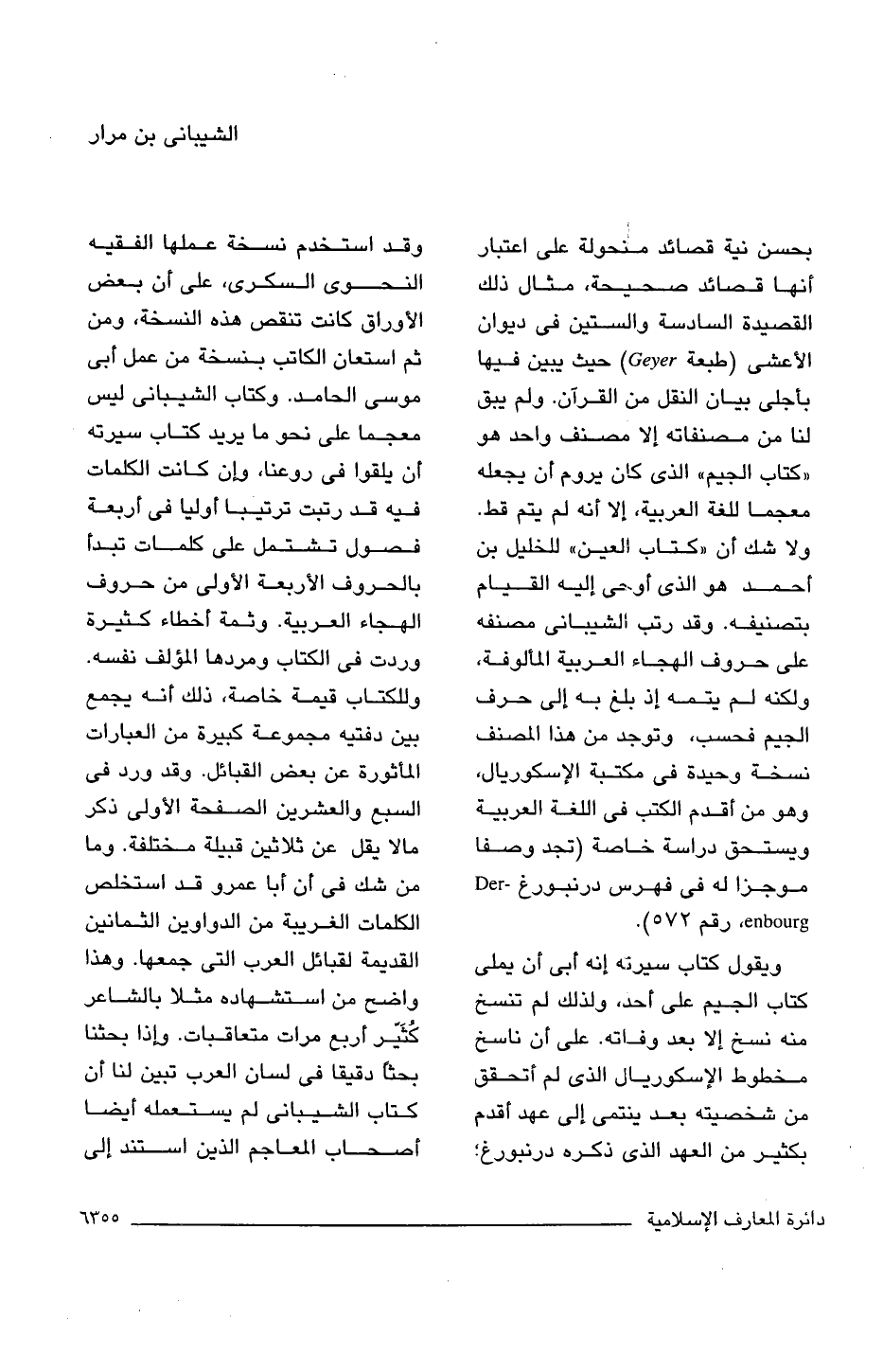 ويقول كتاب سيرته إنه أبى أن يملى كتاب الجيم على أحد، ولذلك لم تنسخ منه نسخ إلا بعد وفاته. على أن ناسخ مخطوط الإسكوريال الذى لم أتحقق من شخصيته بعد ينتمى إلى عهد أقدم بكثير من العهد الذى ذكره درنبورغ؛ وقد استخدم نسخة عملها الفقيه النحوى السكرى، على أن بعض الأوراق كانت تنقص هذه النسخة، ومن ثم استعان الكاتب بنسخة من عمل أبى موسى الحامد. وكتاب الشيبانى ليس معجما على نحو ما يريد كتاب سيرته أن يلقوا فى روعنا، وإن كانت الكلمات فيه قد رتبت ترتيبا أوليا فى أربعة فصول تشتمل على كلمات تبدأ بالحروف الأربعة الأولى من حروف الهجاء العربية. وثمة أخطاء كثيرة وردت فى الكتاب ومردها المؤلف نفسه. وللكتاب قيمة خاصة، ذلك أنه يجمع بين دفتيه مجموعة كبيرة من العبارات المأثورة عن بعض القبائل. وقد ورد فى السبع والعشرين الصفحة الأولى ذكر ما لا يقل عن ثلاثين قبيلة مختلفة. وما من شك فى ان أبا عمرو قد استخلص الكلمات الغريبة من الدواوين الثمانين القديمة لقبائل العرب التى جمعها. وهذا واضح من استشهاده مثلا بالشاعر كُثَيّر أربع مرات متعاقبات. وإذا بحثنا بحثًا دقيقا فى لسان العرب تبين لنا أن كتاب الشيبانى لم يستعمله أيضا أصحاب المعاجم الذين استند إلى