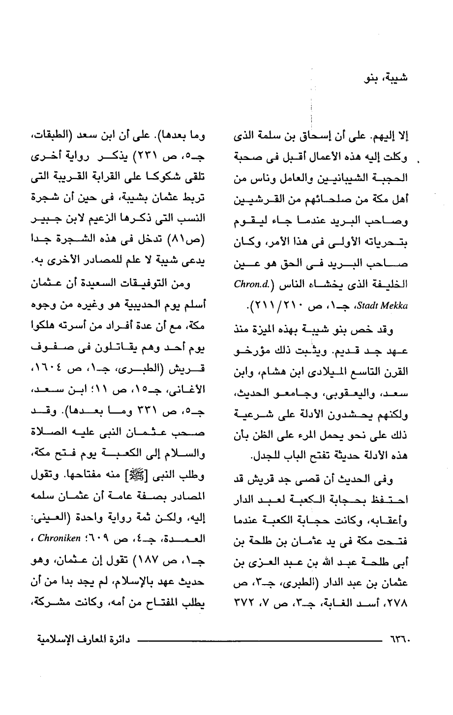وفى الحديث أن قصى جد قريش قد احتفظ بحجابة الكعبة لعبد الدار وأعقابه، وكانت حجابة الكعبة عندما فتحت مكة فى يد عثمان بن طلحة بن أبى طلحة عبد اللَّه بن عبد العزى بن عثمان بن عبد الدار (الطبرى، جـ 3، ص 278، أسد الغابة، جـ 3، ص 7، 372 وما بعدها). على أن ابن سعد (الطبقات، جـ 5، ص 231) يذكر رواية أخرى تلقى شكوكا على القرابة القريبة التى تربط عثمان بشيبة، فى حين أن شجرة النسب التى ذكرها الزعيم لابن جبير (ص 81) تدخل فى هذه الشجرة جدا يدعى شيبة لا علم للمصادر الأخرى به.