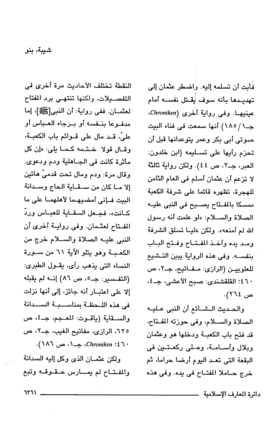 فأبت أن تسلمه إليه. واضطر عثمان إلى تهديدها بأنه سوف يقتل نفسه أمام عينيها. وفى رواية أخرى (Chroniken جـ 1/ 185) أنها سمعت فى فناء البيت صوتى أبى بكر وعمر يتوعدانها قبل أن تحزم رأيها على تسليمه (ابن خلدون: العبر، جـ 2، ص 44). ولكن رواية ثالثة لا تزعم أن عثمان أسلم فى العام الثامن للهجرة، تظهره قائما على شرفة الكعبة ممسكا بالمفتاح يصيح فى النبى عليه الصلاة والسلام: "لو علمت أنه رسول اللَّه لم أمنعه". ولكن عليا تسلق الشرفة ومد يده وأخذ المفتاح وفتح الباب بنفسه. وفى هذه الرواية يبين التشيع للعلويين (الرازى: مفاتيح، جـ 2، ص 460؛ القلقشندى: صبح الأعشى، جـ 4، ص 264).