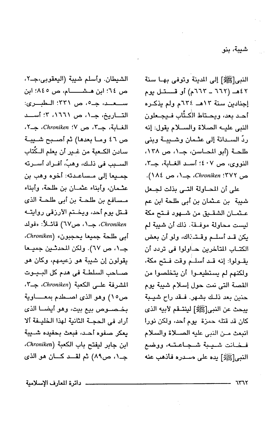 على أن المحاولة التى بذلت لجعل شيبة بن عثمان بن أبى طلحة ابن عم عثمان الشقيق من شهود فتح مكة ليست محاولة موفقة. ذلك أن شيبة لم يكن قد أسلم وقتذاك، ولو أن بعض الكتاب المتأخرين حاولوا فى تردد أن يقولوا: إنه قد أسلم وقت فتح مكة، ولكنهم لم يستطيعوا أن يتخلصوا من القصة التى نمت حول إسلام شيبة يوم حنين بعد ذلك بشهر. فقد راح شيبة يبحث عن النبى [-صلى اللَّه عليه وسلم-] لينتقم لأبيه الذى كان قد قتله حمزة يوم أحد، ولكن نورا انبعث من النبى عليه الصلاة والسلام فخانت شيبة شجاعته، ووضع النبى [-صلى اللَّه عليه وسلم-] يده على صدره فأذهب عنه الشيطان. وأسلم شيبة (اليعقوبى، جـ 2، ص 64؛ ابن هشام، ص 845؛ ابن سعد، جـ 5، ص 331؛ الطبرى: التاريخ، جـ 1، ص 1661, 3؛ أسد الغابة، جـ 3، ص 7؛ Chroniken، جـ 2، ص 46 وما بعدها) ثم أصبح شيبة سادن الكعبة من غير أن يعلم الكُتاب السبب فى ذلك، وهبّ، أفراد أسرته جميعا إلى مساعدته: أخوه وهب بن عثمان، وأبناء عثمان بن طلحة، وأبناء مسافع بن طلحة بن أبى طلحة الذى قتل يوم أحد، ويختم الأرزقى روايته Chroniken, جـ 1، ص 67) قائلًا: "فولد أبى طلحة جميعا يحجبون" (Chroniken, جـ 1، ص 67). ولكن المحدثين جميعا يقولون إن شيبة هو زعيمهم، وكان هو صاحب السلطة فى هدم كل البيوت المشرفة على الكعبة (Chroniken, جـ 3، ص 15) وهو الذى اصطدم بمعاوية بخصوص بيع بيت، وهو أيضا الذى أراد فى الحجة الثانية لهذا الخليفة ألا يعكر صفوه أحد، فبعث بحفيده شيبة ابن جابر ليفتح باب الكعبة (Chroniken، جـ 1، ص 89) ثم لقد كان هو الذى