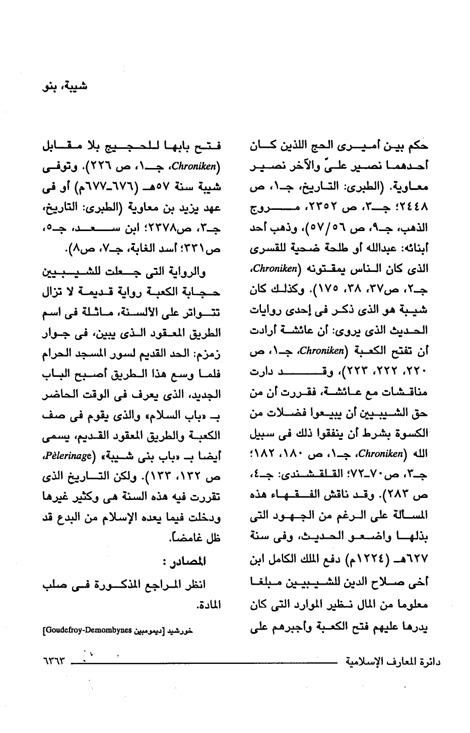 حكم بين أميرى الحج اللذين كان أحدهما نصير علىّ والآخر نصير معاوية. (الطبرى: التاريخ، جـ 1، ص 2248؛ جـ 3، ص 2352، مروج الذهب، جـ 9، ص 56/ 57)، وذهب أحد أبنائه: عبد اللَّه أو طلحة ضحية للقسرى الذى كان الناس يمقتونه (Chroniken، جـ 2، ص 37، 38، 175). وكذلك كان شيبة هو الذى ذكر فى إحدى روايات الحديث الذى يروى: أن عائشة أرادت أن تفتح الكعبة (Chroniken، جـ 1، ص 220، 222، 223)، وقد دارت مناقشات مع عائشة، فقررت أن من حق الشيبيين أن يبيعوا فضلات من الكسوة بشرط أن ينفقوا ذلك فى سبيل اللَّه (Chroniken، جـ 1، ص 180، 182؛ جـ 3، ص 70 - 72؛ القلقشندى: جـ 4، ص 283). وقد ناقش الفقهاء هذه المسألة على الرغم من الجهود التى بذلها واضعو الحديث، وفى سنة 627 هـ (1224 م) دفع الملك الكامل ابن أخى صلاح الدين للشيبيين مبلغا معلوما من المال نظير الموارد التى كان يدرها عليهم فتح الكعبة وأجبرهم على فتح بابها للحجيج بلا مقابل (Chroniken، جـ 1، ص 226). وتوفى شيبة سنة 57 هـ (676 - 677 م) أو فى عهد يزيد بن معاوية (الطبرى: التاريخ، جـ 3، ص 2378؛ ابن سعد، جـ 5، ص 331؛ أسد الغابة، جـ 7، ص 8).