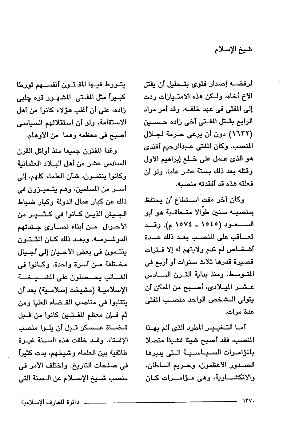 وكان آخر مفت استطاع أن يحتفظ بمنصبه سنين طوالًا متعاقبة هو أبو السعود (1545 - 1574 م). وقد تعاقب على المنصب بعد ذلك عدة أشخاص لم تدم ولايتهم له إلا فترات قصيرة قدرها ثلاث سنوات أو أربع فى المتوسط. ومنذ بداية القرن السادس عشر الميلادى، أصبح من الممكن أن يتولى الشخص الواحد منصب المفتى عدة مرات.