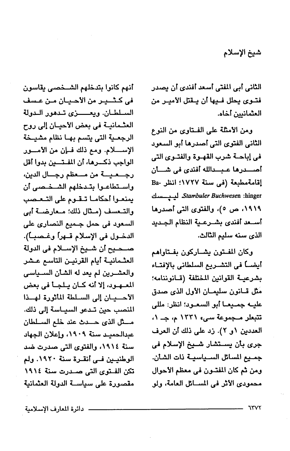 ومن الأمثلة على الفتاوى من النوع الثانى الفتوى التى أصدرها أبو السعود فى إباحة شرب القهوة والفتوى التى أصدرها عبد اللَّه أفندى فى شأن إقامة مطبعة (فى سنة 1727؛ انظر Stambuler Buchwesen: Bahinger، ليبسك 1919، ص 5)، والفتوى التى أصدرها أسعد أفندى بشرعية النظام الجديد الذى سنه سليم الثالث.