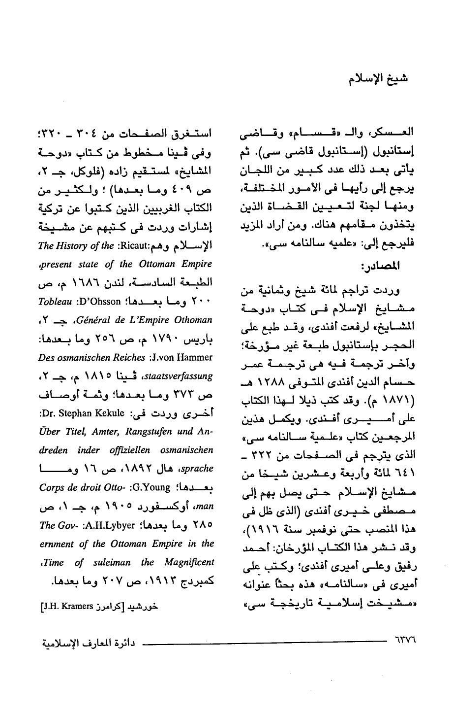 وردت تراجم لمائة شيخ وثمانية من مشايخ الإسلام فى كتاب "دوحة المشايخ" لرفعت أفندى، وقد طبع على الحجر بإستانبول طبعة غير مؤرخة؛ وآخر ترجمة فيه هى ترجمة عمر حسام الدين أفندى المتوفى 1288 هـ (1871 م). وقد كتب ذيلا لهذا الكتاب على أميرى أفندى. ويكمل هذين المرجعين كتاب "علمية سالنامه سى" الذى يترجم فى الصفحات من 322 - 641 لمائة وأربعة وعشرين شيخا من مشايخ الإسلام حتى يصل بهم إلى مصطفى خيرى أفندى (الذى ظل فى هذا المنصب حتى نوفمبر سنة 1916)، وقد نشر هذا الكتاب المؤرخان: أحمد رفيق وعلى أميرى أفندى؛ وكتب على أميرى فى "سالنامه" هذه بحثًا عنوانه "مشيخت إسلامية تاريخجة سى" استغرق الصفحات من 304 - 320؛ وفى فينا مخطوط من كتاب "دوحة المشايخ" لمستقيم زاده (فلوكل، جـ 2، ص 409 وما بعدها)؛ ولكثير من الكتاب الغربيين الذين كتبوا عن تركية إشارات وردت فى كتبهم عن مشيخة الإسلام وهم The History of the present state of the Ottoman Empire: Ricaut، الطبعة السادسة، لندن 1686 م، ص 200 وما بعدها؛ Tobleau General de L'Empire Othoman: D'Ohsson, جـ 2، باريس 1790 م، ص 256 وما بعدها: Des osmanischen Reiches staatsverfassung: J.von Hammer، فينا 1815 م، جـ 2، ص 373 وما بعدها؛ وثمة أوصاف أخرى وردت فى Uber titel Rangstufen und An dreden inder offiziellen osmanischen sprache: Dr. Stephan Kekule، هال 1892، ص 16 وما بعدها؛ Corps de droit Ottoman: G.Young، أوكسفورد 1905 م، جـ 1، ص 285 وما بعدها؛ The Government of the Ottoman Empire in the Time of suleiman the Magnificent: A.H.Lybyer, كمبردج 1913، ص 207 وما بعدها.