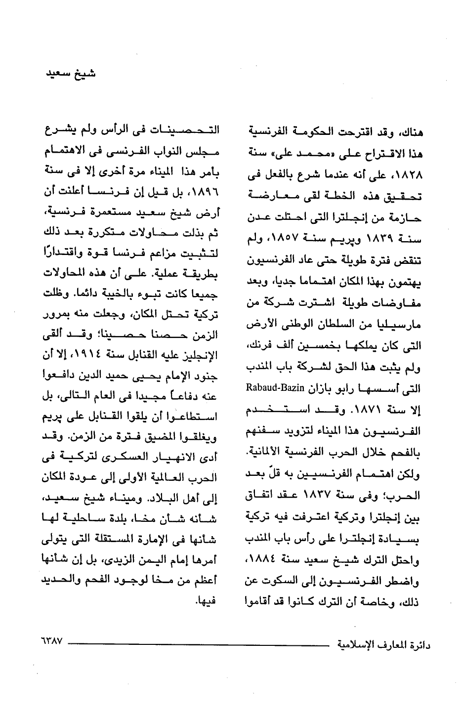 هناك، وقد اقترحت الحكومة الفرنسية هذا الاقتراح على "محمد على" سنة 1828, على أنه عندما شرع بالفعل فى تحقيق هذه الخطة لقى معارضة حازمة من إنجلترا التى احتلت عدن سنة 1839 وبريم سنة 1857، ولم تنقض فترة طويلة حتى عاد الفرنسيون يهتمون بهذا المكان اهتماما جديا، وبعد مفاوضات طويلة اشترت شركة من مارسيليا من السلطان الوطنى الأرض التى كان يملكها بخمسين ألف فرنك، ولم يثبت هذا الحق لشركة باب المندب التى أسسها رابو بازان Rabaud-Razin إلا سنة 1871. وقد استخدم الفرنسيون هذا الميناء لتزويد سفنهم بالفحم خلال الحرب الفرنسية الألمانية. ولكن اهتمام الفرنسيين به قلّ بعد الحرب؛ وفى سنة 1837 عقد اتفاق بين إنجلترا وتركية اعترفت فيه تركية بسيادة إنجلترا على رأس باب المندب واحتل الترك شيخ سعيد سنة 1884، واضطر الفرنسيون إلى السكوت عن ذلك، وخاصة أن الترك كانوا قد أقاموا التحصينات فى الرأس ولم يشرع مجلس النواب الفرنسى فى الاهتمام بأمر هذا الميناء مرة أخرى إلا فى سنة 1896, بل قيل إن فرنسا أعلنت أن أرض شيخ سعيد مستعمرة فرنسية، ثم بذلت محاولات متكررة بعد ذلك لتثبيت مزاعم فرنسا قوة واقتدارّا بطريقة عملية. على أن هذه المحاولات جميعا كانت تبوء بالخيبة دائما. وظلت تركية تحتل المكان، وجعلت منه بمرور الزمن حصنا حصينا؛ وقد ألقى الإنجليز عليه القنابل سنة 1914، إلا أن جنود الإمام يحيى حميد الدين دافعوا عنه دفاعًا مجيدا فى العام التالى، بل استطاعوا أن يلقوا القنابل على بريم ويغلقوا المضيق فترة من الزمن. وقد أدى الانهيار العسكرى لتركية فى الحرب العالمية الأولى إلى عودة المكان إلى أهل البلاد. وميناء شيخ سعيد، شأنه شأن مخا، بلدة ساحلية لها شأنها فى الإمارة المستقلة التى يتولى أمرها إمام اليمن الزيدى، بل إن شأنها أعظم من مخا لوجود الفحم والحديد فيها.
