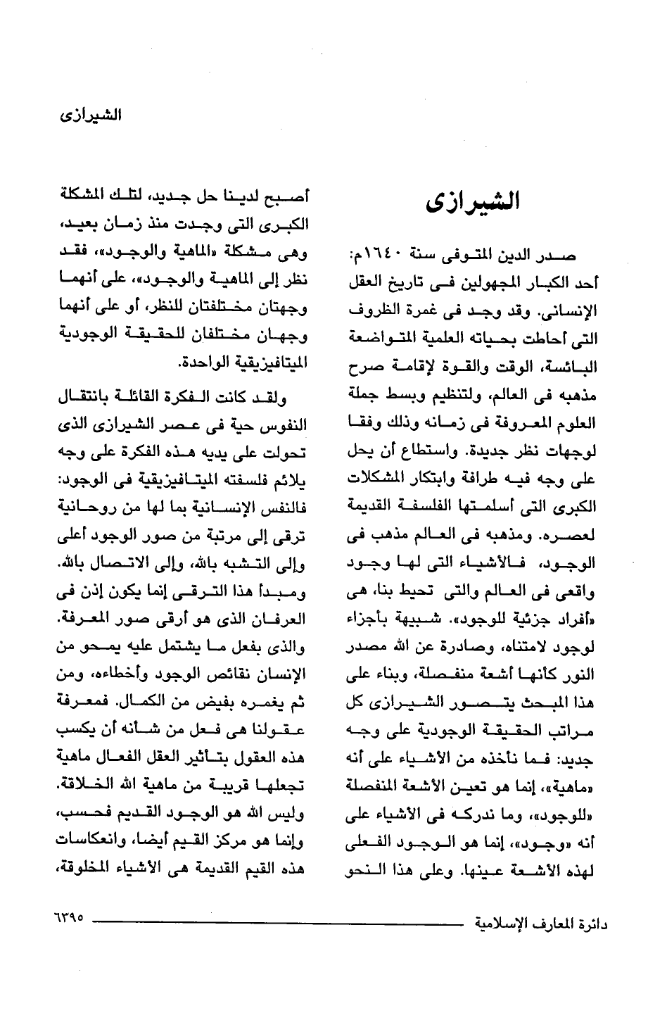 صدر الدين المتوفى سنة 1640 م: أحد الكبار المجهولين فى تاريخ العقل الإنسانى. وقد وجد فى غمرة الظروف التى أحاطت بحياته العلمية المتواضعة البائسة، الوقت والقوة لإقامة صرح مذهبه فى العالم، ولتنظيم وبسط جملة العلوم المعروفة فى زمانه وذلك وفقا لوجهات نظر جديدة. واستطاع أن يحل على وجه فيه طرافة وابتكار المشكلات الكبرى التى أسلمتها الفلسفة القديمة لعصره. ومذهبه فى العالم مذهب فى الوجود، فالأشياء التى لها وجود واقعى فى العالم والتى تحيط بنا، هى "أفراد جزئية للوجود". شبيهة بأجزاء لوجود لامتناه، وصادرة عن اللَّه مصدر النور كأنها أشعة منفصلة، وبناء على هذا المبحث يتصور الشيرازى كل مراتب الحقيقة الوجودية على وجه جديد: فما نأخذه من الأشياء على أنه "ماهية"، إنما هو تعين الأشعة المنفصلة "للوجود"، وما ندركه فى الأشياء على أنه "وجود"، إنما هو الوجود الفعلى لهذه الأشعة عينها. وعلى هذا النحو أصبح لدينا حل جديد، لتلك المشكلة الكبرى التى وجدت منذ زمان بعيد، وهى مشكلة "الماهية والوجود"، فقد نظر إلى الماهية والوجود"، على أنهما وجهتان مختلفتان للنظر، أو على أنهما وجهان مختلفان للحقيقة الوجودية الميتافيزيقية الواحدة.