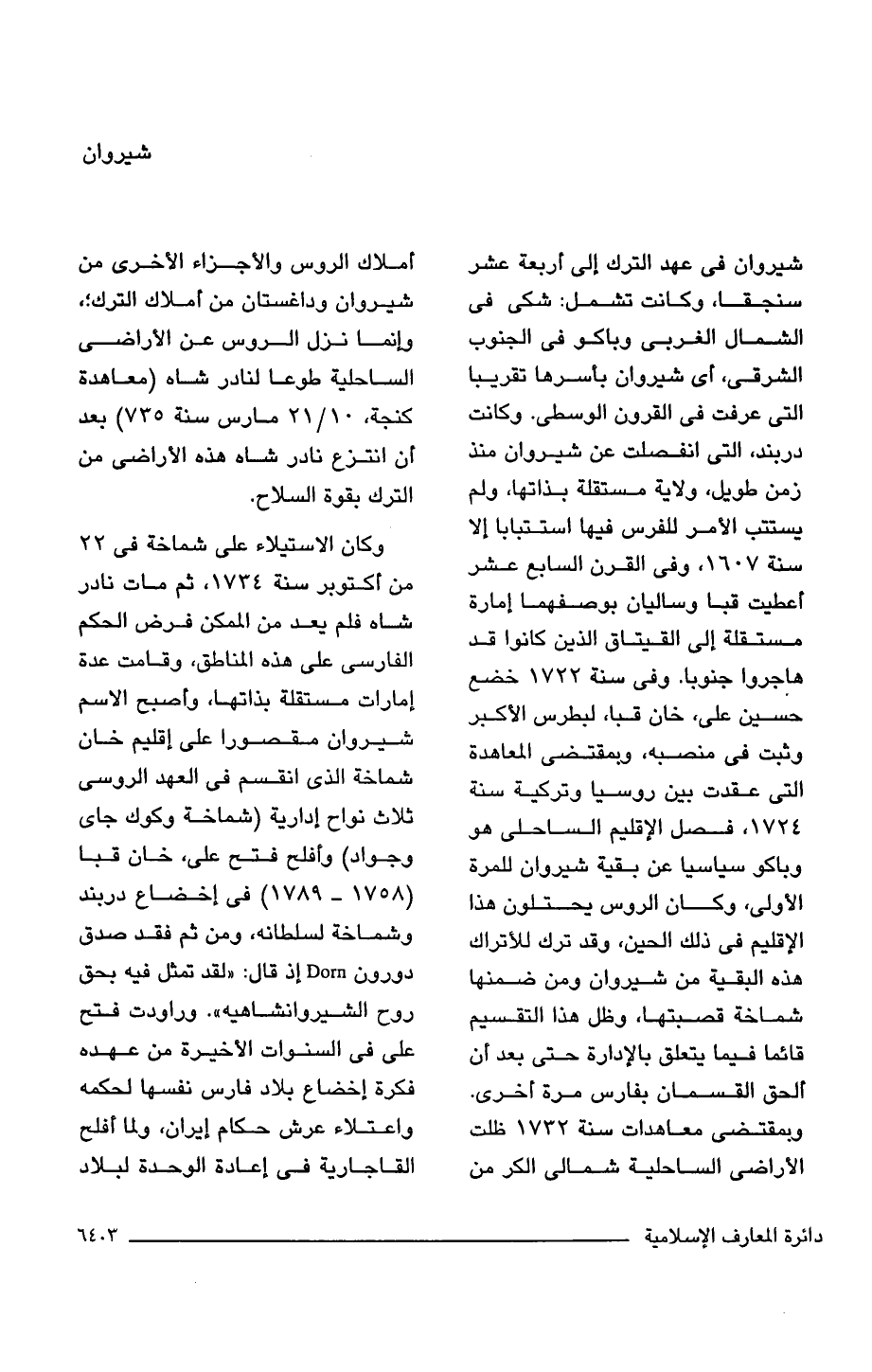 شيروان فى عهد الترك إلى أربعة عشر سنجقا، وكانت تشمل: شكى فى الشمال الغربى وباكو فى الجنوب الشرقى، أى شيروان بأسرها تقريبا التى عرفت فى القرون الوسطى. وكانت دربند، التى انفصلت عن شيروان منذ زمن طويل، ولاية مستقلة بذاتها، ولم يستتب الأمر للفرس فيها استتبابا إلا سنة 1607، وفى القرن السابع عشر أعطيت قبا وساليان بوصفهما إمارة مستقلة إلى القيتاق الذين كانوا قد هاجروا جنوبا. وفى سنة 1722 خضع حسين على، خان قبا، لبطرس الأكبر وثبت فى منصبه، وبمقتضى المعاهدة التى عقدت بين روسيا وتركية سنة 1724، فصل الإقليم الساحلى هو وباكو سياسيا عن بقية شيروان للمرة الأولى، وكان الروس يحتلون هذا الإقليم فى ذلك الحين، وقد ترك للأتراك هذه البقية من شيروان ومن ضمنها شماخة قصبتها، وظل هذا التقسيم قائما فيما يتعلق بالإدارة حتى بعد أن ألحق القسمان بفارس مرة أخرى. وبمقتضى معاهدات سنة 1732 ظلت الأراضى الساحلية شمالى الكر من أملاك الروس والأجزاء الأخرى من شيروان وداغستان من أماوك الترك؛ ، وإنما نزل الروس عن الأراضى الساحلية طوعا لنادر شاه (معاهدة كنجة، 10/ 21 مارس سنة 735) بعد أن انتزع نادر شاه هذه الأراضى من الترك بقوة السلاح.