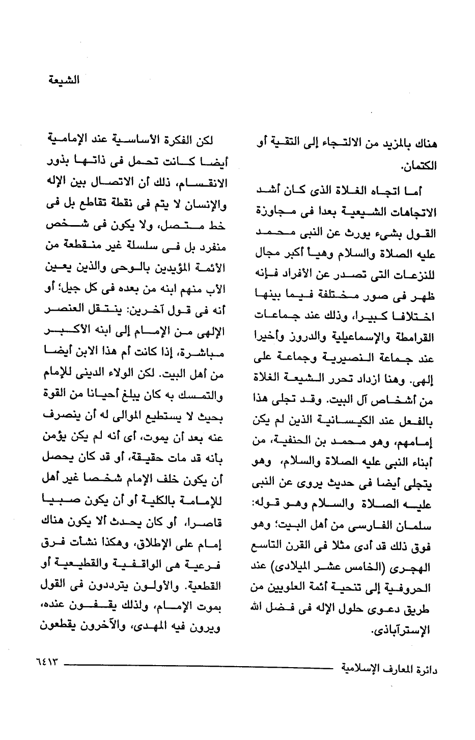 لكن الفكرة الأساسية عند الإمامية أيضا كانت تحمل فى ذاتها بذور الانقسام، ذلك أن الاتصال بين الإله والإنسان لا يتم فى نقطة تقاطع بل فى خط متصل، ولا يكون فى شخص منفرد بل فى سلسلة غير منقطعة من الأئمة المؤيدين بالوحى والذين يعين الأب منهم ابنه من بعده فى كل جيل؛ أو أنه فى قول آخرين: ينتقل العنصر الإلهى من الإمام إلى ابنه الأكبر مباشرة، إذا كانت أم هذا الابن أيضا من أهل البيت. لكن الولاء الدينى للإمام والتمسك به كان يبلغ أحيانا من القوة بحيث لا يستطيع الموالى له أن ينصرف عنه بعد أن يموت، أى أنه لم يكن يؤمن بأنه قد مات حقيقة، أو قد كان يحصل أن يكون خلف الإمام شخصا غير أهل للإمامة بالكلية أو أن يكون صبيا قاصرا، أو كان يحدث ألا يكون هناك إمام على الإطلاق، وهكذا نشأت فرق فرعية هى الواقفية والقطيعية أو القطعية. والأولون يترددون فى القول بموت الإمام، ولذلك يقفون عنده، ويرون فيه المهدى، والآخرون يقطعون