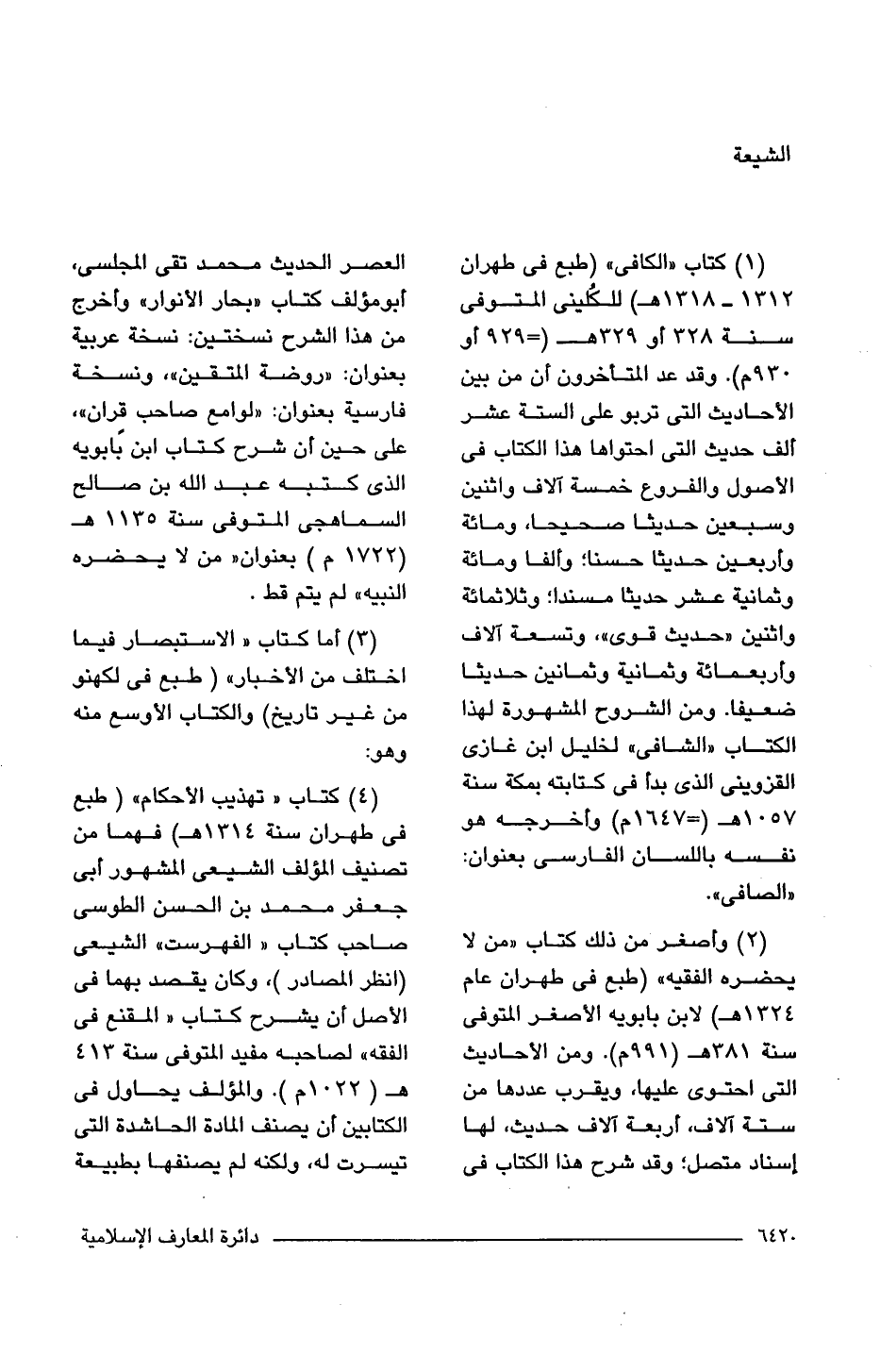 (2) وأصغر من ذلك كتاب "من لا يحضره الفقيه" (طبع فى طهران عام 1324 هـ) لابن بابويه الأصغر المتوفى سنة 381 هـ (991 م). ومن الأحاديث التى احتوى عليها، ويقرب عددها من ستة آلاف، أربعة آلاف حديث، لها إسناد متصل؛ وقد شرح هذا الكتاب فى العصر الحديث محمد تقى المجلسى، أبو مؤلف كتاب "بحار الأنوار" وأخرج من هذا الشرح نسختين: نسخة عربية بعنوان: "روضة المتقين"، ونسخة فارسية بعنوان: "لوامع صاحب قران"، على حين أن شرح كتاب ابن بابويه الذى كتبه عبد اللَّه بن صالح السماهجى المتوفى سنة 1135 هـ (1722 م) بعنوان "من لا يحضره النبيه" لم يتم قط.