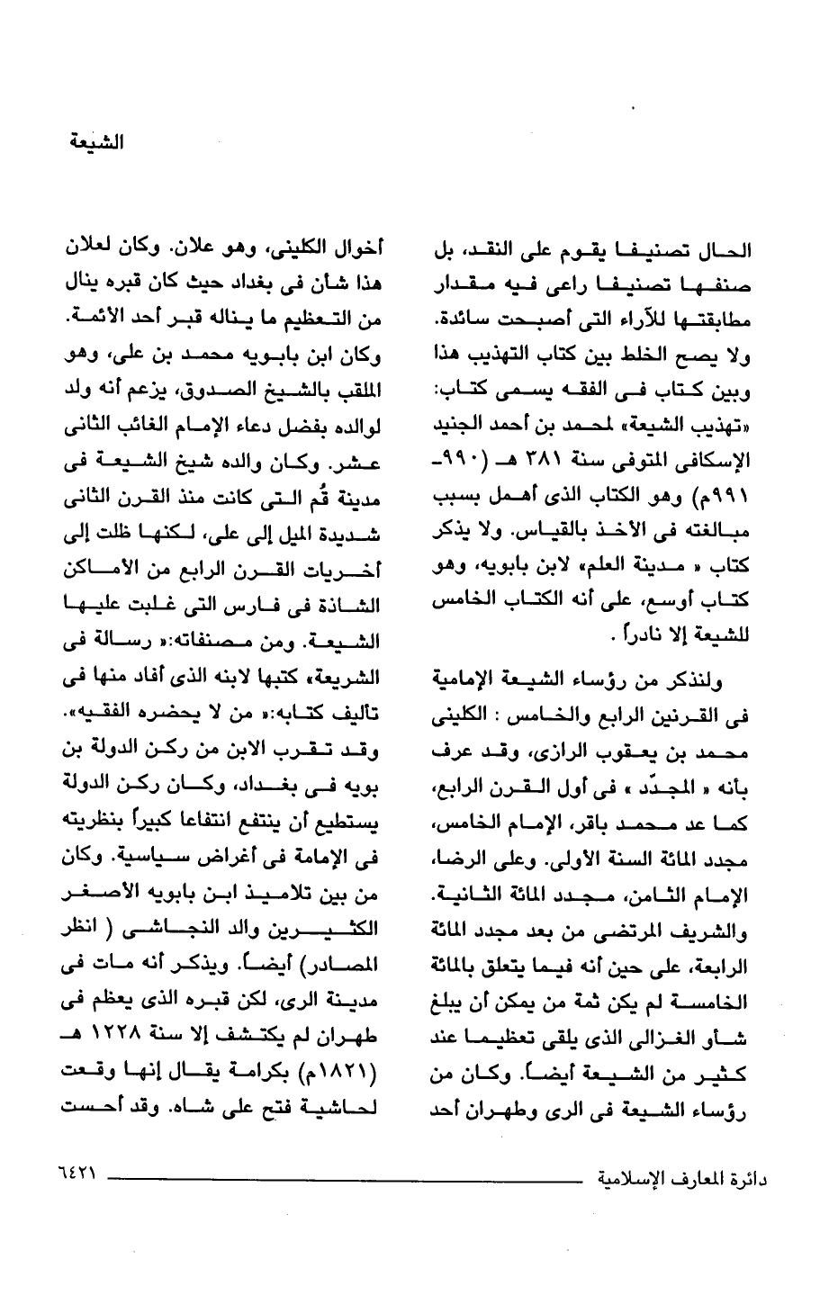 الحال تصنيفا يقوم على النقد، بل صنفها تصنيفا راعى فيه مقدار مطابقتها للآراء التى أصبحت سائدة. ولا يصح الخلط بين كتاب التهذيب هذا وبين كتاب فى الفقه يسمى كتاب: "تهذيب الشيعة" لمحمد بن أحمد الجنيد الإسكافى المتوفى سنة 381 هـ (990 - 991 م) وهو الكتاب الذى أهمل بسبب مبالغته فى الأخذ بالقياس. ولا يذكر كتاب "مدينة العلم" لابن بابويه، وهو كتاب أوسع، على أنه الكتاب الخامس للشيعة إلا نادرًا. ولنذكر من رؤساء الشيعة الإمامية فى القرنين الرابع والخامس: الكلينى محمد بن يعقوب الرازى، وقد عرف بأنه "المجدّد" فى أول القرن الرابع، كما عد محمد باقر، الإمام الخامس، مجدد المائة السنة الأولى. وعلى الرضا، الإمام الثامن، مجدد المائة الثانية. والشريف المرتضى من بعد مجدد المائة الرابعة، على حين أنه فيما يتعلق بالمائة الخامسة لم يكن ثمة من يمكن أن يبلغ شأو الغزالى الذى يلقى تعظيما عند كثير من الشيعة أيضًا. وكان من رؤساء الشيعة فى الرى وطهران أحد أخوال الكلينى، وهو علان. وكان لعلان هذا شأن فى بغداد حيث كان قبره ينال من التعظيم ما يناله قبر أحد الأئمة. وكان ابن بابويه محمد بن على، وهو الملقب بالشيخ الصدوق، يزعم أنه ولد لوالده بفضل دعاء الإمام الغائب الثانى عشر. وكان والده شيخ الشيعة فى مدينة قُم التى كانت منذ القرن الثانى شديدة الميل إلى على، لكنها ظلت إلى أخريات القرن الرابع من الأماكن الشاذة فى فارس التى غلبت عليها الشيعة. ومن مصنفاته: "رسالة فى الشريعة" كتبها لابنه الذى أفاد منها فى تأليف كتابه: "من لا يحضره الفقيه". وقد تقرب الابن من ركن الدولة بن بويه فى بغداد، وكان ركن الدولة يستطيع أن ينتفع انتفاعا كبيرًا بنظريته فى الإمامة فى أغراض سياسية. وكان من بين تلاميذ ابن بابويه الأصغر الكثيرين والد النجاشى (انظر المصادر) أيضًا. ويذكر أنه مات فى مدينة الرى، لكن قبره الذى يعظم فى طهران لم يكتشف إلا سنة 1228 هـ (1821 م) بكرامة يقال إنها وقعت لحاشية فتح على شاه. وقد أحست