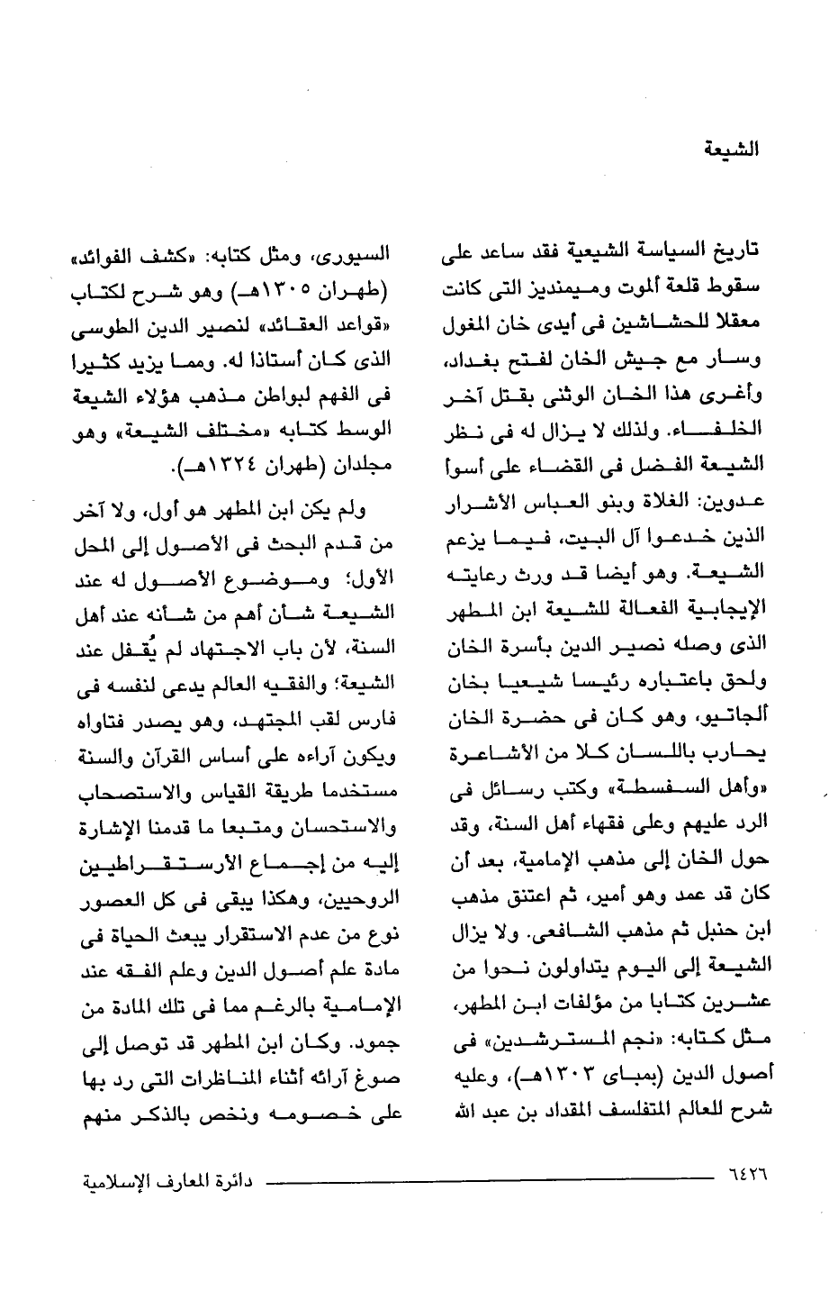 تاريخ السياسة الشيعية فقد ساعد على سقوط قلعة ألموت وميمنديز التى كانت معقلا للحشاشين فى أيدى خان المغول وسار مع جيش الخان لفتح بغداد، وأغرى هذا الخان الوثنى بقتل آخر الخلفاء. ولذلك لا يزال له فى نظر الشيعة الفضل فى القضاء على أسوأ عدوين: الغلاة وبنو العباس الأشرار الذين خدعوا آل البيت، فيما يزعم الشيعة. وهو أيضا قد ورث رعايته الإيجابية الفعالة للشيعة ابن المطهر الذى وصله نصير الدين بأسرة الخان ولحق باعتباره رئيسا شيعيا بخان ألجاتيو، وهو كان فى حضرة الخان يحارب باللسان كلا من الأشاعرة "وأهل السفسطة" وكتب رسائل فى الرد عليهم وعلى فقهاء أهل السنة، وقد حول الخان إلى مذهب الإمامية، بعد أن كان قد عمد وهو أمير، ثم اعتنق مذهب ابن حنبل ثم مذهب الشافعى. ولا يزال الشيعة إلى اليوم يتداولون نحوا من عشرين كتابا من مؤلفات ابن المطهر، مثل كتابه: "نجم المسترشدين" فى أصول الدين (بمباى 1303 هـ)، وعليه شرح للعالم المتفلسف المقداد بن عبد اللَّه السيورى، ومثل كتابه: "كشف الفوائد" (طهران 1305 هـ) وهو شرح لكتاب "قواعد العقائد" لنصير الدين الطوسى الذى كان أستاذا له. ومما يزيد كثيرا فى الفهم لبواطن مذهب هؤلاء الشيعة الوسط كتابه "مختلف الشيعة" وهو مجلدان (طهران 1324 هـ).