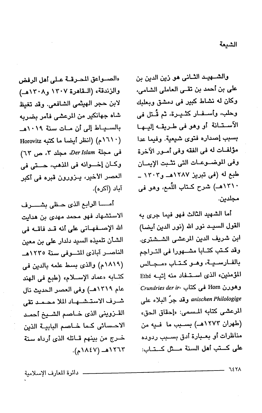 أما الشهيد الثالث فهو فيما جرى به القول السيد نور اللَّه (نور الدين أيضا) ابن شريف الدين المرعشى الششترى. وقد كتب كتابا مشهورا فى التراجم بالفارسية، وهو كتاب "مجالس المؤمنين" الذى استفاد منه إتيه Ethe وهورن Horn فى كتاب Crundries der iranischen Philologige وقد جرّ البلاء على المرعشى كتابه المسمى: "إحقاق الحق" (طهران 1273 هـ) بسبب ما فيه من مناظرات أو بعبارة أدق بسبب ردوده على كتب أهل السنة مثل كتاب: "الصواعق المحرقة على أهل الرفض والزندقة" (القاهرة 1307 و 1308 هـ) لابن حجر الهيثمى الشافعى. وقد تغيظ شاه جهانكير من المرعشى فأمر بضربه بالسياط إلى أن مات سنة 1019 هـ. (1610 م) (انظر أيضا ما كتبه Horovitz فى مجلة, Der Islam مجلد 3، ص 63) وكان إخوانه فى المذهب، حتى فى العصر الأخير، يزورون قبره فى أكبر آباد (آكره).
