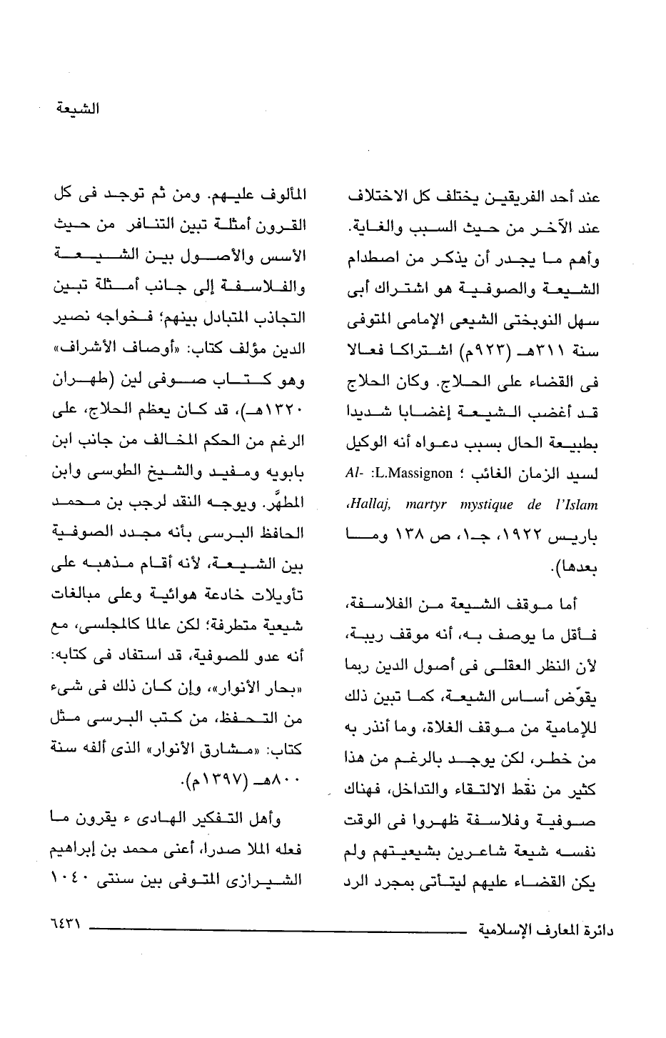 عند أحد الفريقين يختلف كل الاختلاف عند الآخر من حيث السبب والغاية. وأهم ما يجدر أن يذكر من اصطدام الشيعة والصوفية هو اشتراك أبى سهل النوبختى الشيعى الإمامى المتوفى سنة 311 هـ (923 م) اشتراكا فعالا فى القضاء على الحلاج. وكان الحلاج قد أغضب الشيعة إغضابا شديدا بطبيعة الحال بسبب دعواه أنه الوكيل لسيد الزمان الغائب؛ Al Hallaj, martyr mystique de l'Islam: L.Massignon, باريس 1922، جـ 1، ص 138 وما بعدها)