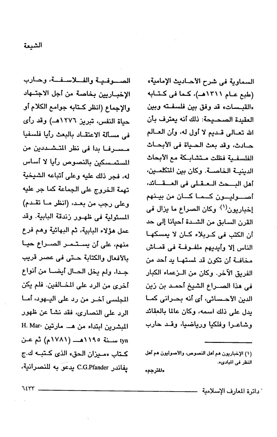 السماوية فى شرح الأحاديث الإمامية، (طبع عام 1311 هـ)، كما فى كتابه "القبسات" قد وفق بين فلسفته وبين العقيدة الصحيحة: ذلك أنه يعترف بأن اللَّه تعالى قديم لا أول، وأن العالم حادث، وقد بعث الحياة فى الأبحاث الفلسفية فظلت متشابكة مع الأبحاث الدينية الخاصة. وكان بين المتكلمين، أهل البحث العقلى فى العقائد، أصوليون كما كان من بينهم إخباريون (¬1) وكان الصراع ما يزال فى القرن السابق من الشدة أحيانا إلى حد أن الكتب فى كربلاء كان لا يمسكها الناس إلا وأيديهم ملفوفة فى قماش مخافة أن تكون قد لمستها يد أحد من الفريق الآخر. وكان من الزعماء الكبار فى هذا الصراع الشيخ أحمد بن زين الدين الأحسائى، أى أنه بحرانى كما يدل على ذلك اسمه، وكان عالما بالعقائد وشاعرا وفلكيا ورياضيا، وقد حارب الصوفية والفلاسفة، وحارب الإخباريين بخاصة من أجل الاجتهاد والإجماع (انظر كتابه جوامع الكلام أو حياة النفس، تبريز 1276 هـ) وقد رأ ى فى مسألة الاعتقاد بالبعث رأيا فلسفيا مسرفا بدا فى نظر المتشددين من المستمسكين بالنصوص رأيا لا أساس له، فجر ذلك عليه وعلى أتباعه الشيخية تهمة الخروج على الجماعة كما جر عليه وعلى رجب من بعد، (انظر ما تقدم) المسئولية فى ظهور زندقة البابية. وقد عمل هؤلاء البابية، ثم البهائية وهم فرع منهم، على أن يستمر الصراع حيا بالأفعال والكتابة حتى فى عصر قريب جدا، ولم يخل الحال أيضا من أنواع أخرى من الرد على المخالفين. فلم يكن المجلسى آخر من رد على اليهود، أما الرد على النصارى، فقد نشأ عن ظهور المبشرين ابتداء من هـ. مارتين H. Martyn سنة 1195 هـ (1781 م) ثم عن كتاب "ميزان الحق" الذى كتبه ك. ج بفاندر C.G.Pfander يدعو به للنصرانية،
