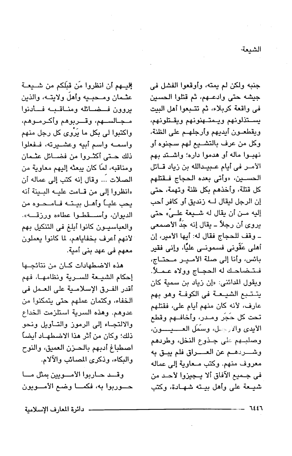 جنبه ولكن لم يمته، وأوقعوا الفشل فى جيشه حتى وادعهم، ثم قتلوا الحسين فى واقعة كربلاء، ثم تتبعوا أهل البيت يستذلونهم ويمتهنونهم ويقتلونهم، ويقطعون أيديهم وأرجلهم على الظنة، وكل من عرف بالتشيع لهم سجنوه أو نهبوا ماله أو هدموا داره؛ واشتد بهم الأمر فى أيام عبيد اللَّه بن زياد قاتل الحسين، "وأتى بعده الحجاج فقتلهم كل قتلة، وأخذهم بكل ظنة وتهمة، حتى إن الرجل ليقال له زنديق أو كافر أحب إليه من أن يقال له شيعة علىّ" حتى يروى أن رجلًا -يقال إنه جَدُّ الأصمعى- وقف للحجاج فقال له: أيها الأمير، إن أهلى عَقّونى فسمونى عليّا، وإنى فقير بائس، وأنا إلى صلة الأمير محتاج، فتضاحك له الحجاج وولاه عملًا. ويقول المدائنى: "إن زياد بن سمية كان يتتبع الشيعة فى الكوفة وهو بهم عارف، لأنه كان منهم أيام على، فقتلهم تحت كل حَجَر ومدر، وأخافهم وقطع الأيدى والأرجل، وسَمَل العيون، وصلبهم على جذوع النخل، وطردهم وشردهم عن العراق فلم يبق به معروف منهم. وكتب معاوية إلى عماله فى جميع الآفاق ألا يجيزوا لأحد من شيعة على وأهل بيته شهادة، وكتب إليهم أن انظروا مَن قِبَلكم من شيعة عثمان ومحبيه وأهل ولايته، والذين يروون فضائله ومناقبه فأدنوا مجالسهم، وقربوهم وأكرموهم، واكتبوا لى بكل ما يَرْوى كل رجل منهم واسمه واسم أبيه وعشيرته، ففعلوا ذلك حتى أكثروا من فضائل عثمان ومناقبه، لِمَا كان يبعثه إليهم معاوية من الصلات. . . وقال إنه كتب إلى عماله أن "انظروا إلى من قامت عليه البينة أنه يحب عليًا وأهل بيته فامحوه من الديوان، وأسقطوا عطاءه ورزقه". والعباسيون كانوا أبلغ فى التنكيل بهم لأنهم أعرف بخفاياهم، لما كانوا يعملون معهم فى عهد بنى أمية.