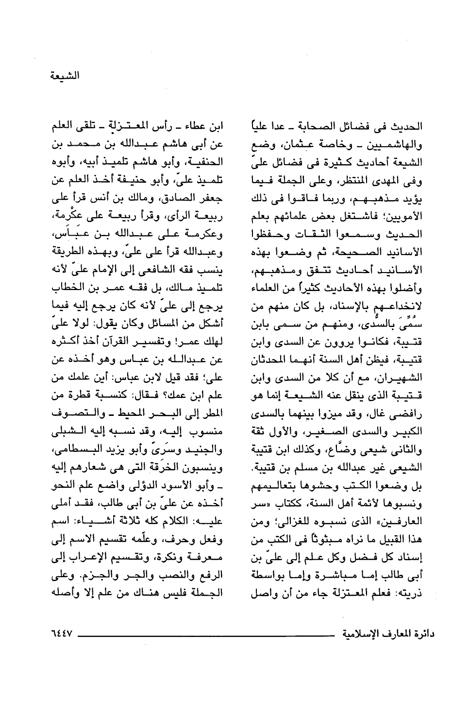 الحديث فى فضائل الصحابة -عدا عليًا والهاشميين- وخاصة عثمان، وضع الشيعة أحاديث كثيرة فى فضائل علىّ وفى المهدى المنتظر، وعلى الجملة فيما يؤيد مذهبهم، وربما فاقوا فى ذلك الأمويين؛ فاشتغل بعض علمائهم بعلم الحديث وسمعوا الثقات وحفظوا الأسانيد الصحيحة، ثم وضعوا بهذه الأسانيد أحاديث تتفق ومذهبهم، وأضلوا بهذه الأحاديث كثيرًا من العلماء لانخداعهم بالإسناد، بل كان منهم من سُمِّى بالسُّدى، ومنهم من سمى بابن قتيبة، فكانوا يروون عن السدى وابن قتيبة، فيظن أهل السنة أنهما المحدثان الشهيران، مع أن كلا من السدى وابن قتيبة الذى ينقل عنه الشيعة إنما هو رافضى غال، وقد ميزوا بينهما بالسدى الكبير والسدى الصغير، والأول ثقة والثانى شيعى وضَّاع، وكذلك ابن قتيبة الشيعى غير عبد اللَّه بن مسلم بن قتيبة. بل وضعوا الكتب وحشوها بتعاليمهم ونسبوها لأئمة أهل السنة، ككتاب "سر العارفين" الذى نسبوه للغزالى؛ ومن هذا القبيل ما نراه مبثوثًا فى الكتب من إسناد كل فضل وكل علم إلى علىّ بن أبى طالب إما مباشرة وإما بواسطة ذريته: فعلم المعتزلة جاء من أن واصل ابن عطاء -رأس المعتزلة- تلقى العلم عن أبى هاشم عبد اللَّه بن محمد بن الحنفية، وأبو هاشم تلميذ أبيه، وأبوه تلميذ علىّ، وأبو حنيفة أخذ العلم عن جعفر الصادق، ومالك بن أنس قرأ على ربيعة الرأى، وقرأ ربيعة على عِكْرمة، وعكرمة على عبد اللَّه بن عبَاس، وعبد اللَّه قرأ على علىّ، وبهذه الطريقة ينسب فقه الشافعى إلى الإمام علىّ لأنه تلميذ مالك، بل فقه عمر بن الخطاب يرجع إلى علىّ لأنه كان يرجع إليه فيما أشكل من المسائل وكان يقول: لولا علىّ لهلك عمر! وتفسير القرآن أخذ أكثره عن عبد اللَّه بن عباس وهو أخذه عن على؛ فقد قيل لابن عباس: أين علمك من علم ابن عمك؛ فقال: كنسبة قطرة من المطر إلى البحر المحيط -والتصوف منسوب إليه، وقد نسبه إليه الشبلى والجنيد وسَرىّ وأبو يزيد البسطامى، وينسبون الخرَقة التى هى شعارهم إليه- وأبو الأسود الدؤلى واضع علم النحو أخذه عن علىّ بن أبى طالب، فقد أملى عليه: الكلام كله ثلاثة أشياء: اسم وفعل وحرف، وعلّمه تقسيم الاسم إلى معرفة ونكرة، وتقسيم الإعراب إلى الرفع والنصب والجر والجزم. وعلى الجملة فليس هناك من علم إلا وأصله