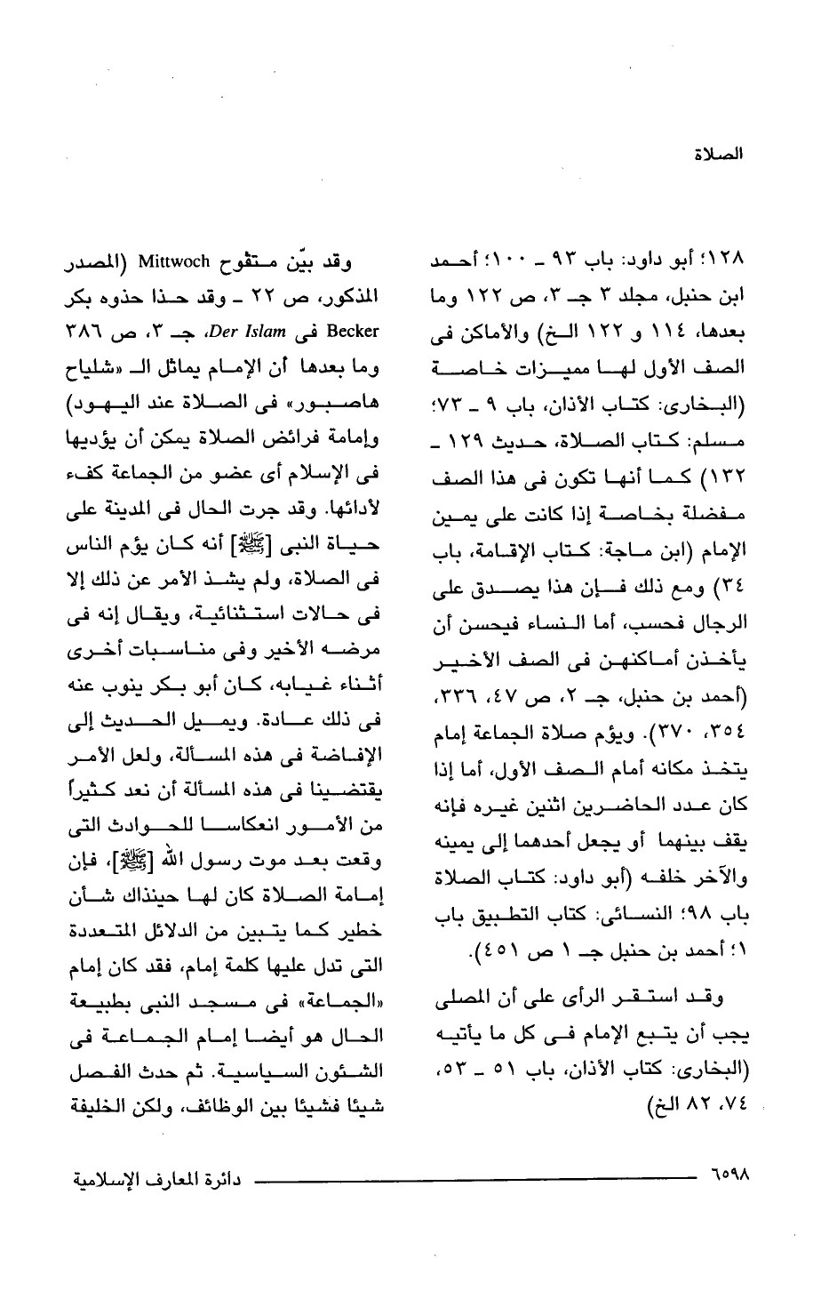 128؛ أبو داود: باب 93 - 100؛ أحمد ابن حنبل، مجلد 3 جـ 3، ص 122 وما بعدها, 114 و 122 الخ) والأماكن فى الصف الأول لها مميزات خاصة (البخارى: كتاب الأذان، باب 9 - 73؛ مسلم: كتاب الصلاة، حديث 129 - 132) كما أنها تكون فى هذا الصف مفضلة بخاصة إذا كانت على يمين الإمام (ابن ماجه: كتاب الإقامة، باب 34) ومع ذلك فإن هذا يصدق على الرجال فحسب، أما النساء فيحسن أن يأخذن أماكنهن فى الصف الأخير أحمد بن حنبل، جـ 2، ص 47, 336, 354, 370). ويؤم صلاة الجماعة إمام يتخذ مكانه أمام الصف الأول، أما إذا كان عدد الحاضرين اثنين غيره فإنه يقف بينهما أو يجعل أحدهما إلى يمينه والآخر خلفه (أبو داود: كتاب الصلاة باب 98؛ النسائى: كتاب التطبيق باب 1؛ أحمد بن حنبل جـ 1 ص 451).
