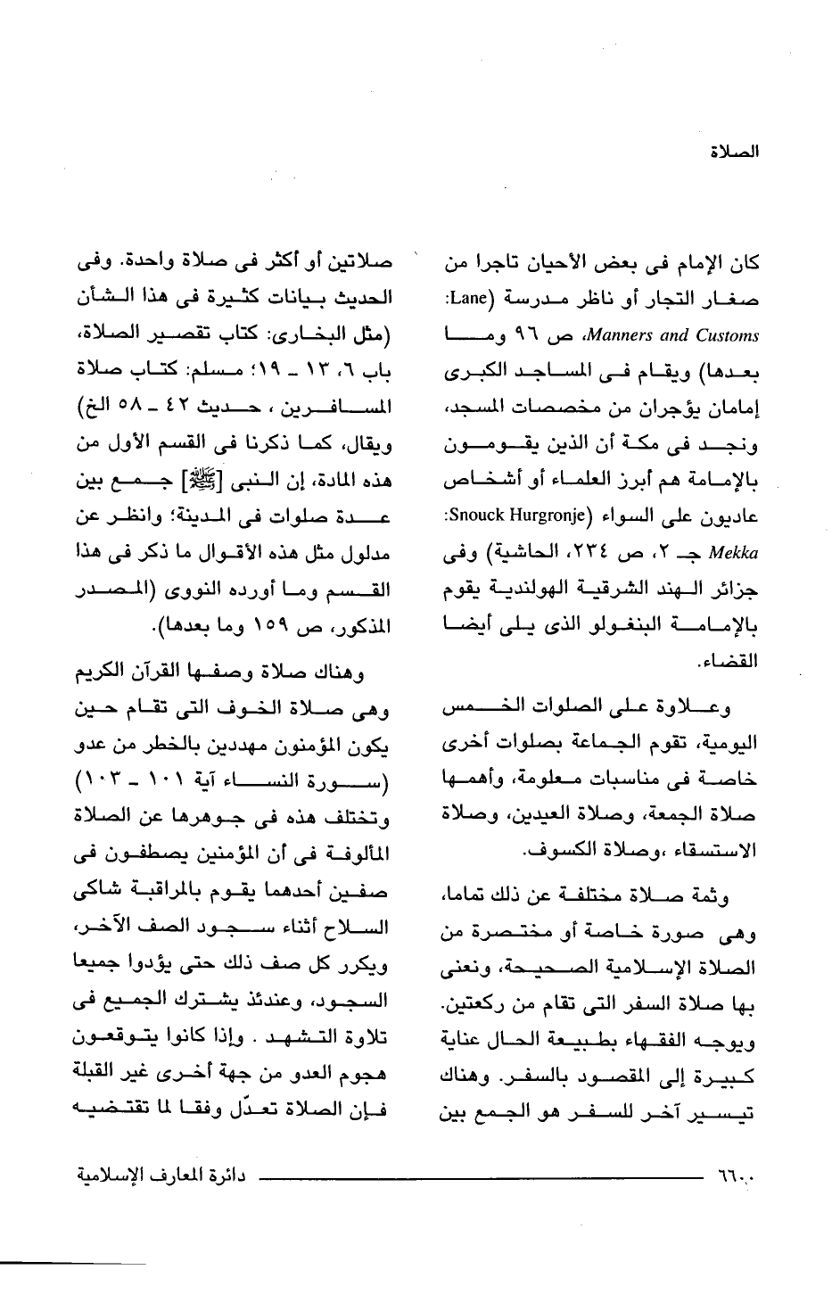 وثمة صلاة مختلفة عن ذلك تماما، وهى صورة خاصة أو مختصرة من الصلاة الإسلامية الصحيحة, ونعنى بها صلاة السفر التى تقام من ركعتين. ويوجه الفقهاء بطبيعة الحال عناية كبيرة إلى المقصود بالسفر. وهناك تيسير آخر للسفر هو الجمع بين صلاتين أو أكثر فى صلاة واحدة. وفى الحديث بيانات كثيرة فى هذا الشأن (مثل البخارى: كتاب تقصير الصلاة، باب 6, 13 - 19؛ مسلم: كتاب صلاة المسافرين، حديث 42 - 58 الخ) ويقال، كما ذكرنا فى القسم الأول من هذه المادة، إن النبى [-صلى اللَّه عليه وسلم-] جمع بين عدة صلوات فى المدينة؛ وانظر عن مدلول مثل هذه الأقوال ما ذكر فى هذا القسم وما أورده النووى (المصدر المذكور، ص 59 أو ما بعدها).
