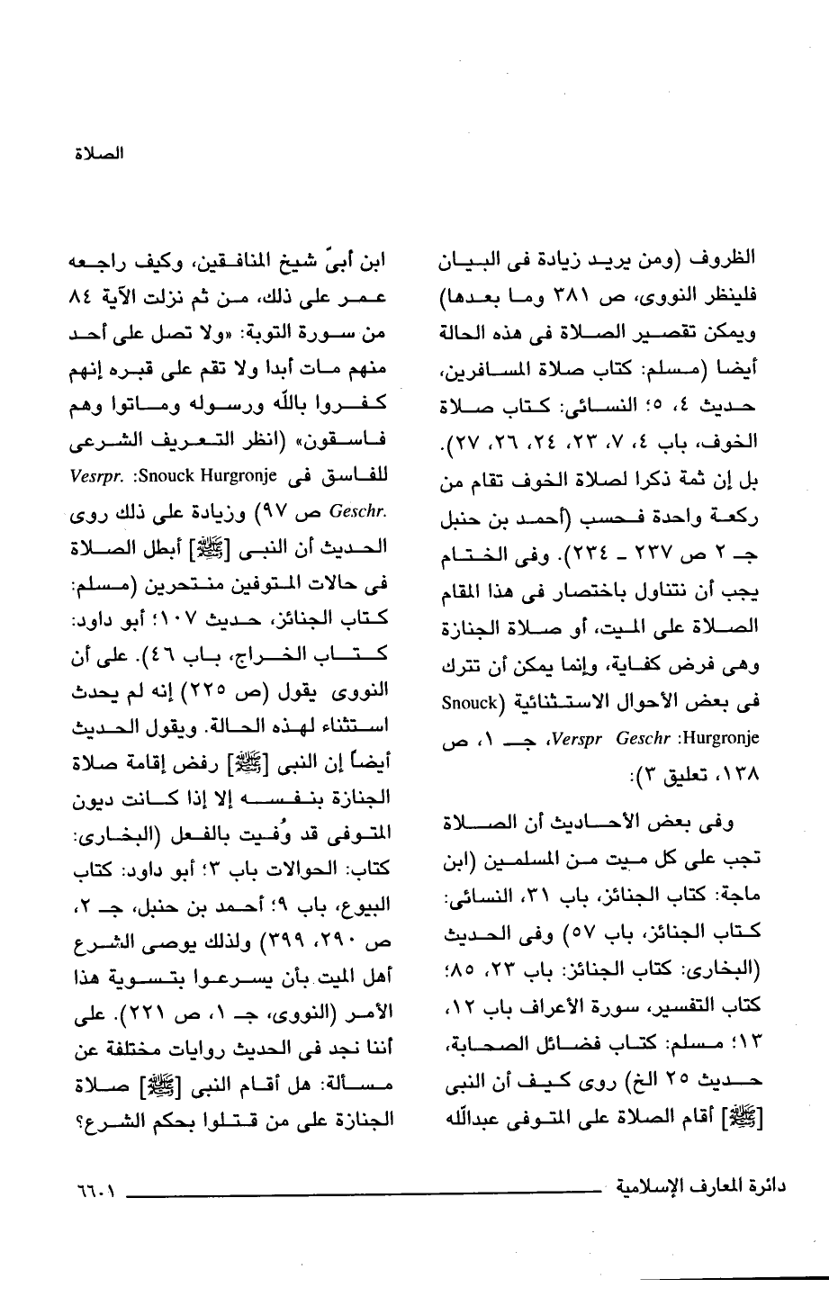 الظروف (ومن يريد زيادة فى البيان فلينظر النووى، ص 381 وما بعدها) ويمكن تقصير الصلاة فى هذه الحالة أيضًا (مسلم: كتاب صلاة المسافرين، حديث 4، 5؛ النسائى: كتاب صلاة الخوف، باب 4, 7, 23, 24, 26, 27). بل إن ثمة ذكرا لصلاة الخوف تقام من ركعة واحدة فحسب (أحمد بن حنبل جـ 2 ص 237 - 234). وفى الختام يجب أن نتناول باختصار فى هذا المقام الصلاة على الميت، أو صلاة الجنازة وهى فرض كفاية، وإنما يمكن أن تترك فى بعض الأحوال الاستثنائية (Verspr Geschr: Snouck Hurgronje, جـ 1، ص 138، تعليق 3).