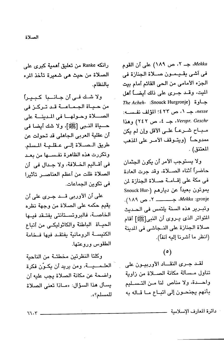 لقد جرى النقاد الأوربيون على تناول مسألة مكانة الصلاة من زاوية واحدة، ولا مناص لنا من التسليم بأنهم يجنحون إلى اتباع ما قاله به رانكه Ranke من تعليق أهمية كبرى على الصلاة من حيث هى شعيرة تأخذ المرء بالنظام.