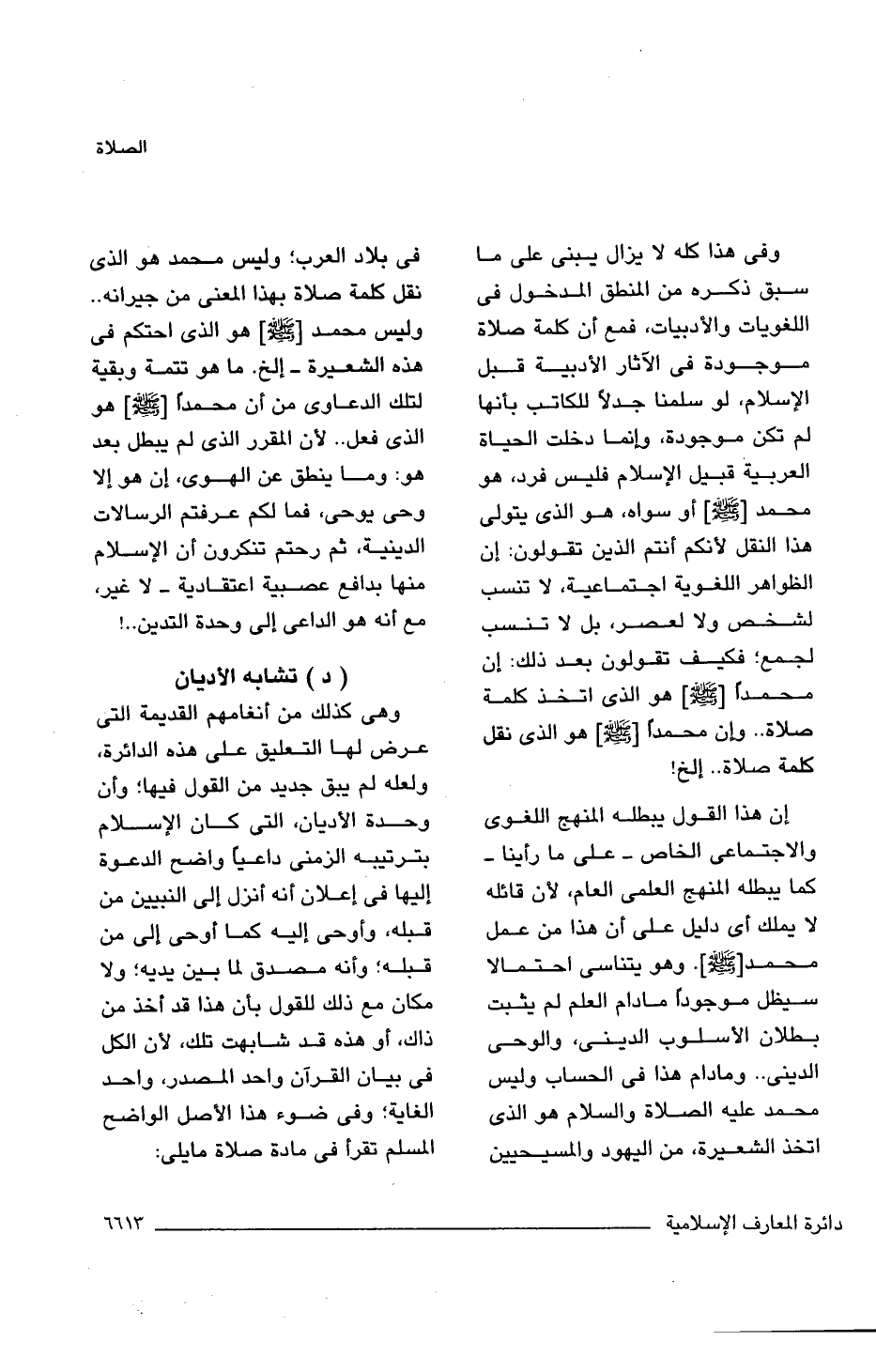 وهى كذلك من أنغامهم القديمة التى عرض لها التعليق على هذه الدائرة، ولعله لم يبق جديد من القول فيها؛ وأن وحدة الأديان، التى كان الإسلام بترتيبه الزمنى داعيا واضح الدعوة إليها فى إعلان أنه أنزل إلى النبيين من قبله، وأوحى إليه كما أوحى إلى من قبله؛ وأنه مصدق لما بين يديه؛ ولا مكان مع ذلك للقول بأن هذا قد أخذ من ذاك، أو هذه قد شابهت تلك؛ لأن الكل فى بيان القرآن واحد المصدر، واحد الغاية؛ وفى ضوء هذا الأصل الواضح المسلم تقرأ فى مادة صلاة ما يلى: