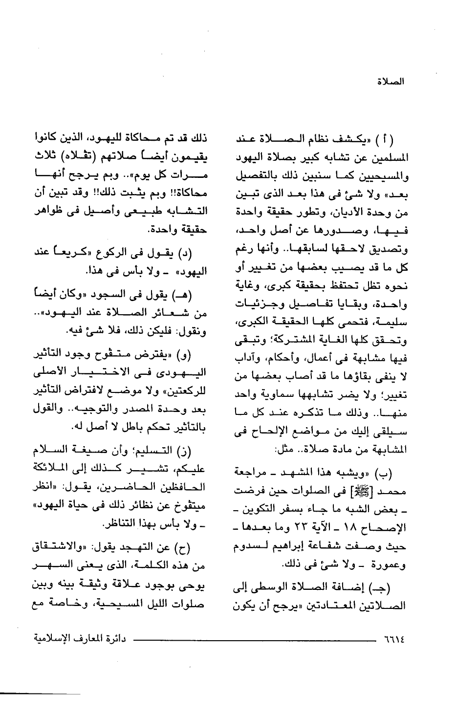 (أ) "يكشف نظام الصلاة عند المسلمين عن تشابه كبير بصلاة اليهود والمسيحيين كما سنبين ذلك بالتفصيل بعد" ولا شئ فى هذا بعد الذى تبين من وحدة الأديان، وتطور حقيقة واحدة فيها، وصدورها عن أصل واحد، وتصديق لاحقها لسابقها. . وأنها رغم كل ما قد يصيب بعضها من تغيير أو نحوه تظل تحتفظ بحقيقة كبرى، وغاية واحدة، وبقايا تفاصيل وجزئيات سليمة، فتحمى كلها الحقيقة الكبرى, وتحقق كلها الغاية المشتركة؛ وتبقى فيها مشابهة فى أعمال، وأحكام، وآداب لا ينفى بقاؤها ما قد أصاب بعضها من تغيير؛ ولا يضر تشابهها سماوية واحد منها. . وذلك ها تذكره عند كل ها سيلقى إليك من مواضع الإلحاح فى المشابهة من مادة صلاة. . مثل: