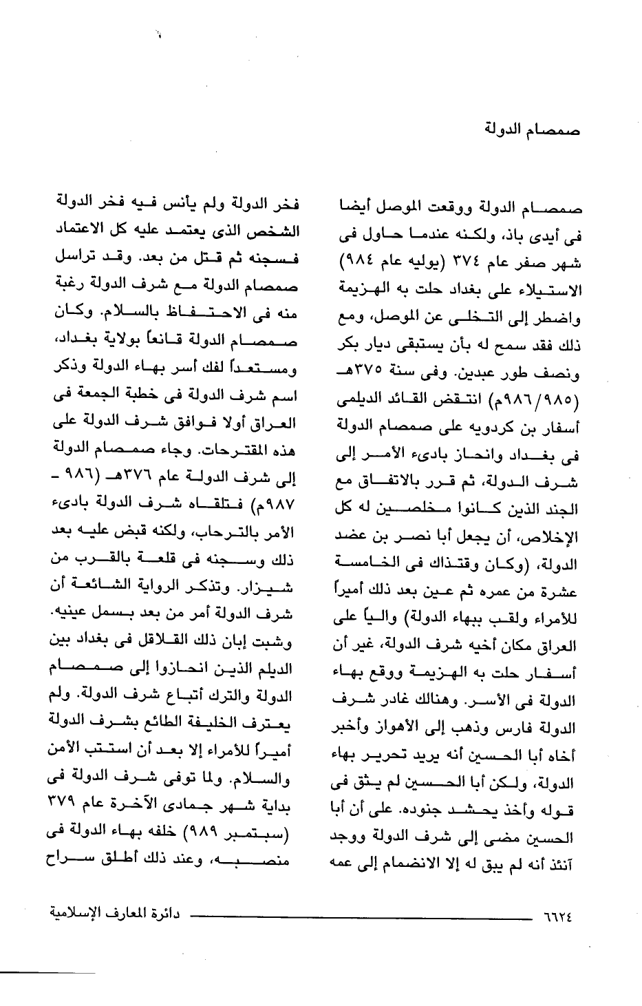 صمصام الدولة ووقعت الموصل أيضًا فى أيدى باذ، ولكنه عندما حاول فى شهر صفر عام 374 (يوليه عام 984) الاستيلاء على بغداد حلت به الهزيمة واضطر إلى التخلى عن الموصل، ومع ذلك فقد سمح له بأن يستبقى ديار بكر ونصف طور عبدين. وفى سنة 375 هـ (985/ 986 م) انتقض القائد الديلمى أسفار بن كردويه على صمصام الدولة فى بغداد وانحاز بادئ الأمر إلى شرف الدولة، ثم قرر بالاتفاق مع الجند الذين كانوا مخلصين له كل الإخلاص، أن يجعل أبا نصر بن عضد الدولة، (وكان وقتذاك فى الخامسة عشرة من عمره ثم عين بعد ذلك أميرًا للأمراء ولقب ببهاء الدولة) واليا على العراق مكان أخيه شرف الدولة، غير أن أسفار حلت به الهزيمة ووقع بهاء الدولة فى الأسر. وهنالك غادر شرف الدولة فارس وذهب إلى الأهواز وأخبر أخاه أبا الحسين أنه يريد تحرير بهاء الدولة، ولكن أبا الحسين لم يثق فى قوله وأخذ يحشد جنوده. على أن أبا الحسين مضى إلى شرف الدولة ووجد آنئذ أنه لم يبق له إلا الانضمام إلى عمه فخر الدولة ولم يأنس فيه فخر الدولة الشخص الذى يعتمد عليه كل الاعتماد فسجنه ثم قتل من بعد. وقد تراسل صمصام الدولة مع شرف الدولة رغبة منه فى الاحتفاظ بالسلام. وكان صمصام الدولة قانعا بولاية بغداد، ومستعدًا لفك أسر بهاء الدولة وذكر اسم شرف الدولة فى خطبة الجمعة فى العراق أولًا فوافق شرف الدولة على هذه المقترحات. وجاء صمصام الدولة إلى شرف الدولة عام 376 هـ (986 - 987 م) فتلقاه شرف الدولة بادئ الأمر بالترحاب، ولكنه قبض عليه بعد ذلك وسجنه فى قلعة بالقرب من شيزار. وتذكر الرواية الشائعة أن شرف الدولة أمر من بعد بسمل عينيه. وشبت إبان ذلك القلاقل فى بغداد بين الديلم الذين انحازوا إلى صمصام الدولة والترك أتباع شرف الدولة. ولم يعترف الخليفة الطائع بشرف الدولة أميرًا للأمراء إلا بعد أن استتب الأمن والسلام. ولما توفى شرف الدولة فى بداية شهر جمادى الآخرة عام 379 (سبتمبر 989) خلفه بهاء الدولة فى منصبه، وعند ذلك أطلق سراح