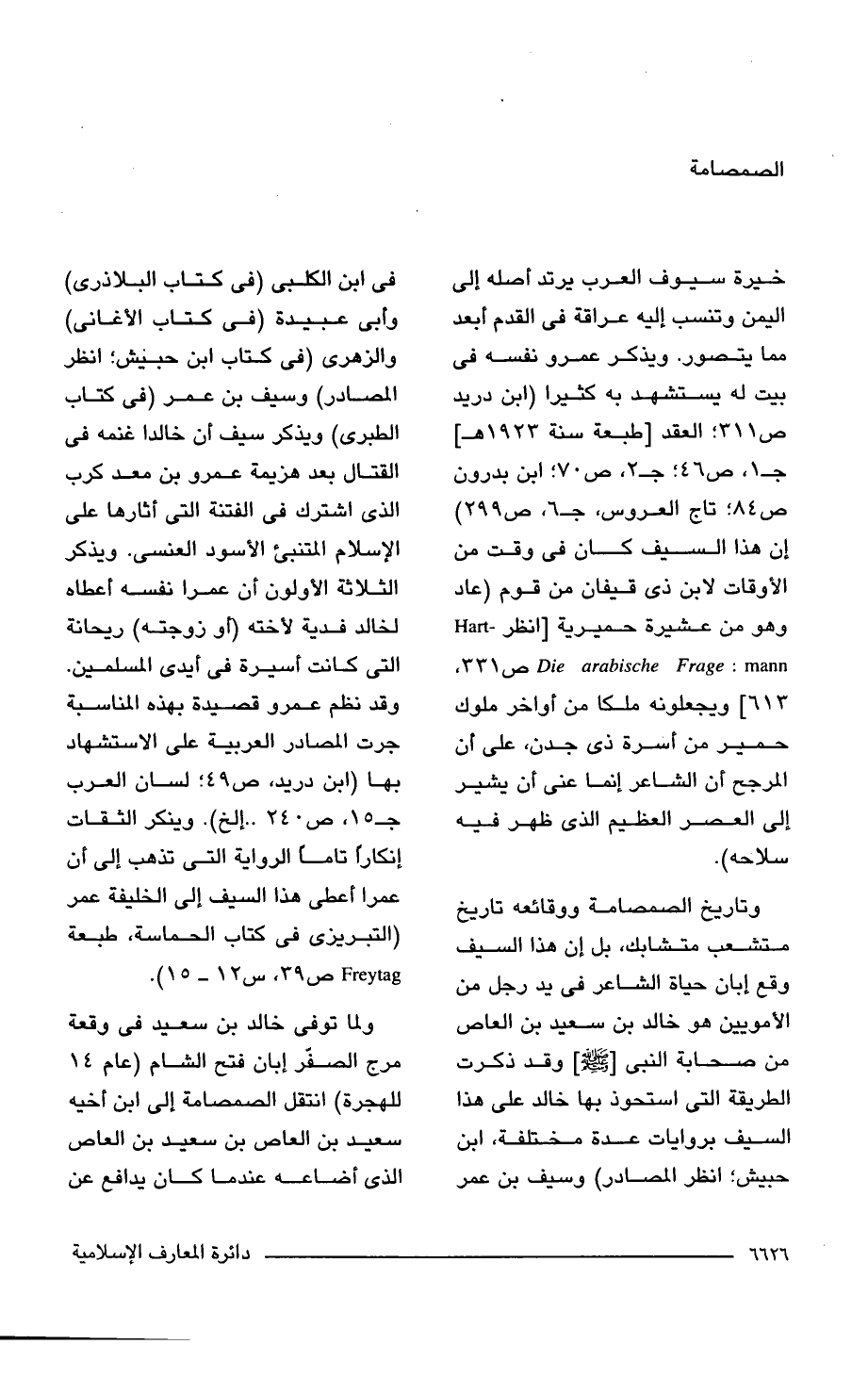 وتاريخ الصمصامة ووقائعه تاريخ متشعب متشابك, بل إن هذا السيف وقع إبان حياة الشاعر فى يد رجل من الأمويين هو خالد بن سعيد بن العاص من صحابة النبى [-صلى اللَّه عليه وسلم-] وقد ذكرت الطريقة التى استحوذ بها خالد على هذا السيف بروايات عدة مختلفة، ابن حبيش؛ انظر المصادر) وسيف بن عمر فى ابن الكلبى (فى كتاب البلاذرى) وأبى عبيدة (فى كتاب الأغانى) والزهرى (فى كتاب ابن حبيش؛ انظر المصادر) وسيف بن عمر (فى كتاب الطبرى) ويذكر سيف أن خالدا غنمه فى القتال بعد هزيمة عمرو بن معد كرب الذى اشترك فى الفتنة التى أثارها على الإسلام المتنبئ الأسود العنسى. ويذكر الثلاثة الأولون أن عمرا نفسه أعطاه لخالد فدية لأخته (أو زوجته) ريحانة التى كانت أسيرة فى أيدى المسلمين. وقد نظم عمرو قصيدة بهذه المناسبة جرت المصادر العربية على الاستشهاد بها (ابن دريد، ص 49؛ لسان العرب جـ 15، ص 240. . إلخ). وينكر الثقات إنكارًا تاما الرواية التى تذهب إلى أن عمرا أعطى هذا السيف إلى الخليفة عمر (التبريزى فى كتاب الحماسة، طبعة Freytag ص 39، س 12 - 15).