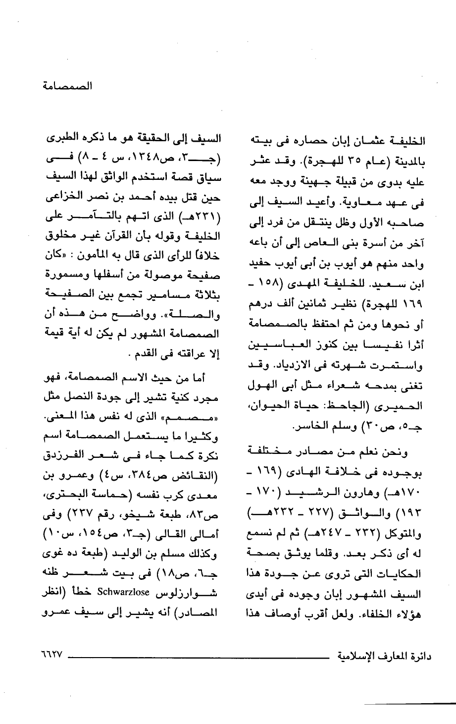 ونحن نعلم من مصادر مختلفة بوجوده فى خلافة الهادى (169 - 170 هـ) وهارون الرشيد (170 - 193) والواثق (227 - 232 هـ) والمتوكل (232 - 247 هـ) ثم لم نسمع له أى ذكر بعد. وقلما يوثق بصحة الحكايات التى تروى عن جودة هذا السيف المشهور إبان وجوده فى أيدى هؤلاء الخلفاء. ولعل أقرب أوصاف هذا السيف إلى الحقيقة هو ما ذكره الطبرى (جـ 3، ص 1348, س 4 - 8) فى سياق قصة استخدم الواثق لهذا السيف حين قتل بيده أحمد بن نصر الخزاعى (231 هـ) الذى اتهم بالتآمر على الخليفة وقوله بأن القرآن غير مخلوق خلافًا للرأى الذى قال به المأمون: "كان صفيحة موصولة من أسفلها ومسمورة بثلاثة مسامير تجمع بين الصفيحة والصلة". وواضح من هذه أن الصمصامة المشهور لم يكن له آية قيمة إلا عراقته فى القدم.