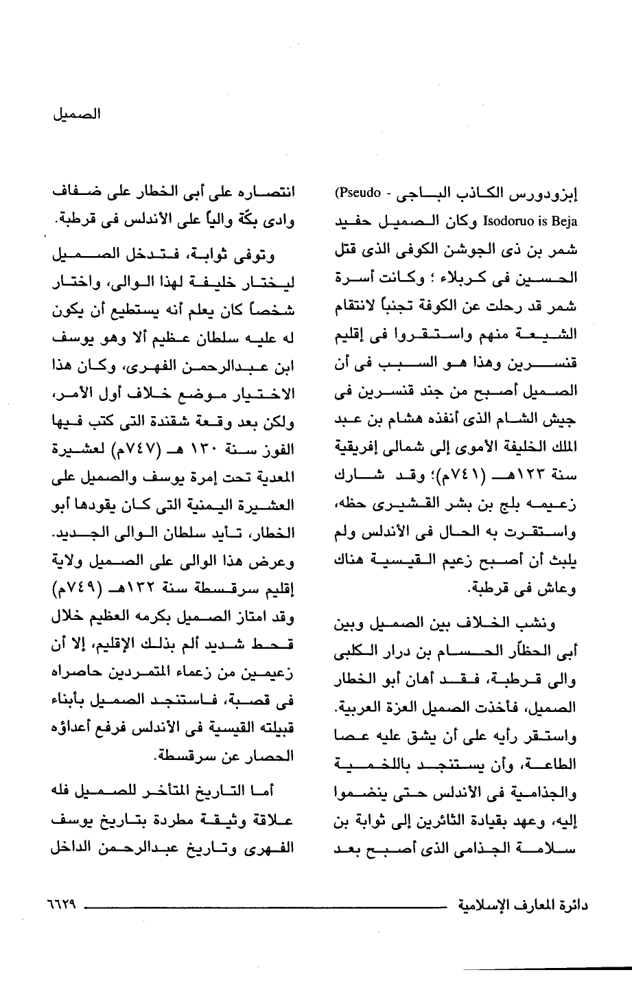 إبزودورس الكاذب الباجى PseudoIsodoruo is Beja) وكان الصميل حفيد شمر بن ذى الجوشن الكوفى الذى قتل الحسين فى كربلاء؛ وكانت أسرة شمر قد رحلت عن الكوفة تجنبًا لانتقام الشيعة منهم واستقروا فى إقليم قنسرين وهذا هو السبب فى أن الصميل أصبح من جند قنسرين فى جيش الشام الذى) نفذه هشام بن عبد الملك الخليفة الأموى إلى شمالى إفريقية سنة 123 هـ (741 م)؛ وقد شارك زعيمه بلج بن بشر القشيرى حظه، واستقرت به الحال فى الأندلس ولم يلبث أن أصبح زعيم القيسية هناك وعاش فى قرطبة.