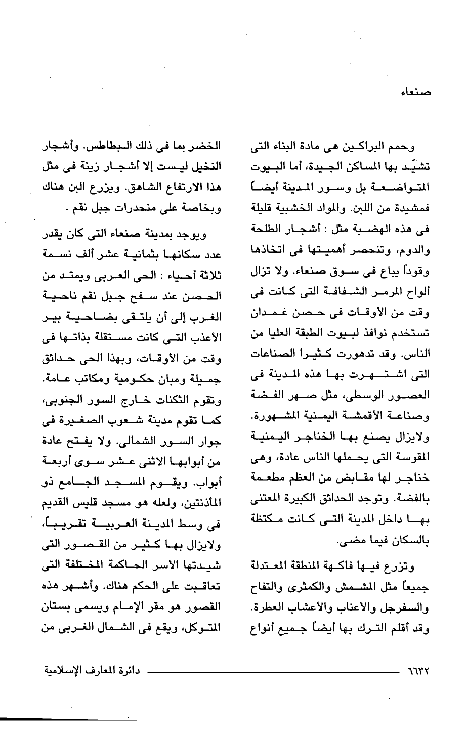 ويوجد بمدينة صنعاء التى كان يقدر عدد سكانها بثمانية عشر ألف نسمة ثلاثة أحياء: الحس العربى ويمتد من الحصين عند سفح جبل نقم ناحية الغرب إلى أن يلتقى بضاحية بير الأعذب التى كانت مستقلة بذاتها فى وقت من الأوقات، وبهذا الحى حدائق جميلة ومبان حكومية ومكاتب عامة. وتقوم الثكنات خارج السور الجنوبى، كما تقوم مدينة شعوب الصغيرة فى جوار السور الشمالى. ولا يفتح عادة من أبوابها الاثنى عشر سوى أربعة أبواب. ويقوم المسجد الجامع ذو المأذنتين، ولعله هو مسجد قليس القديم فى وسط المدينة العربية تقريبا، ولا يزال بها كثير من القصور التى شيدتها الأسر الحاكمة المختلفة التى تعاقبت على الحكم هناك. وأشهر هذه القصور هو مقر الإمام ويسمى بستان المتوكل، ويقع فى الشمال الغربى من