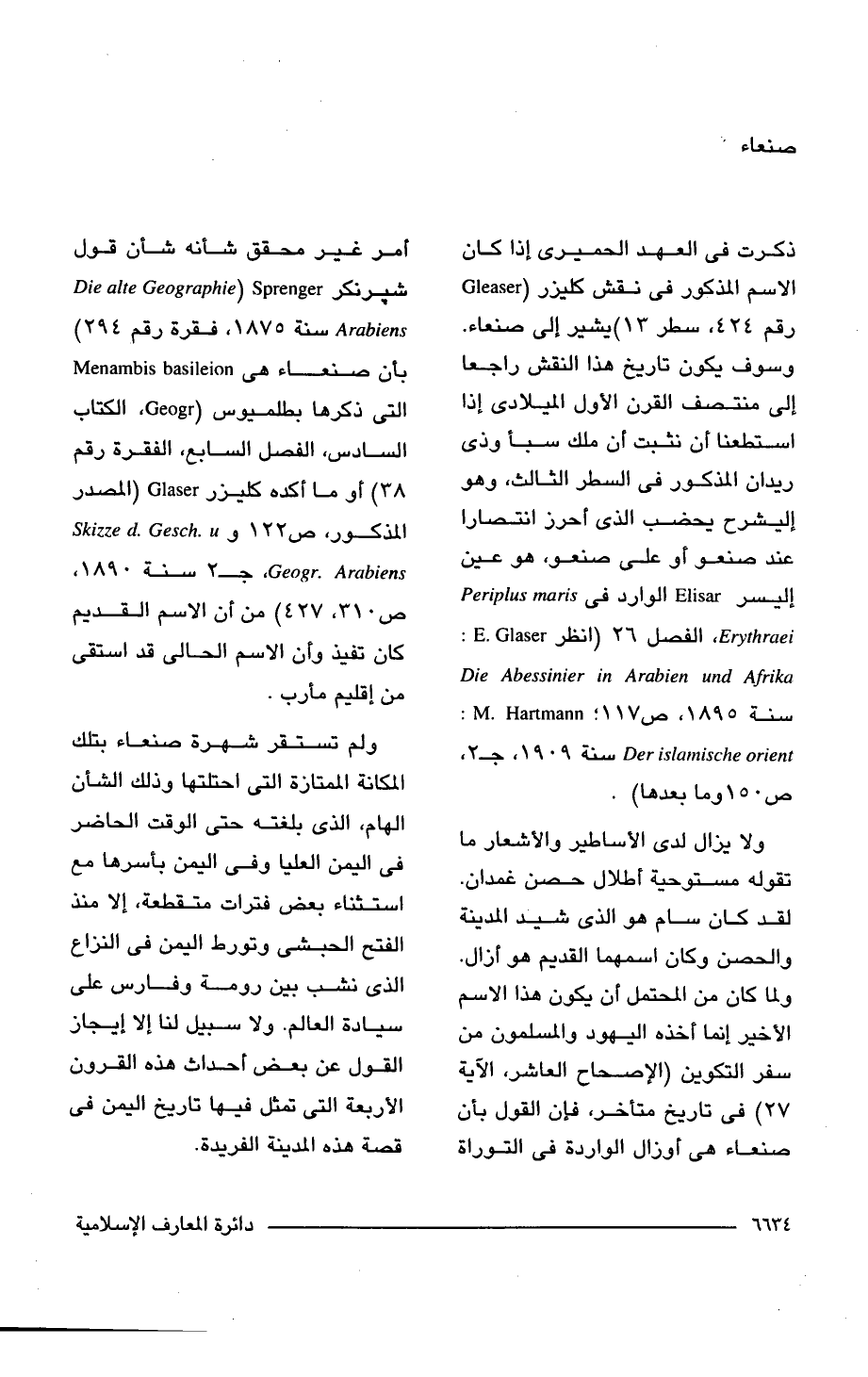 ولا يزال لدى الأساطير والأشعار ما تقوله مستوحية أطاول حصن غمدان. لقد كان سام هو الذى شيد المدينة والحصن وكان اسمهما القديم هو أزال. ولما كان من المحتمل أن يكون هذا الاسم الأخير إنما أخذه اليهود والمسلمون من سفو التكوين (الإصحاح العاشر، الآية 27) فى تاريخ متأخر، فإن القول بأن صنعاء هى أوزال الواردة فى التوراة أمر غير محقق شأنه شأن قول شبرنكر Sprenger (Die alte Geographie Arabiens سنة 1875, فقرة رقم 294) بأن صنعاء هى Menambis basileion التى ذكرها بطلميوس (Geogr, الكتاب السادس، الفصل السابع، الفقرة رقم 38) أو ما أكده كليزر Glaser (المصدر المذكور، ص 122 و Skizze d. Gesch. u Geogr. Arabiens، جـ 2 سنة 1890. ص 310, 427) من أن الاسم القديم كان تفيد وأن الاسم الحالى قد استقى من إقليم مأرب.