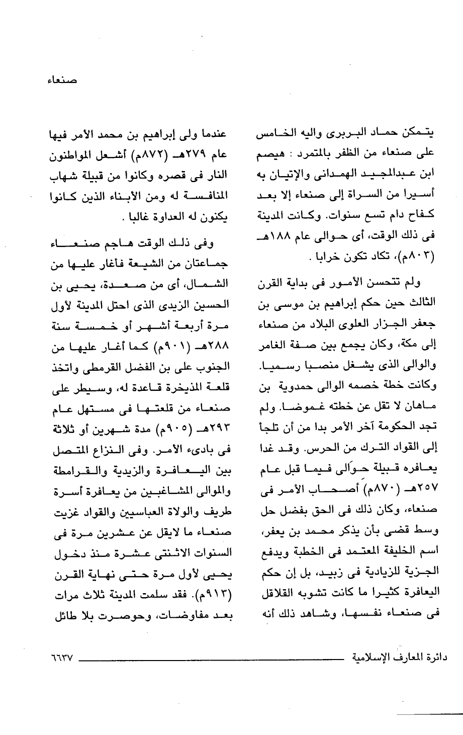 وفى ذلك الوقت هاجم صنعاء جماعتان من الشيعة فأغار عليها من الشمال، أى من صعدة، يحيى بن الحسين الزيدى الذى احتل المدينة لأول مرة أربعة أشهر أو خمسة سنة 288 هـ (901 م) كما أغار عليها من الجنوب على بن الفضل القرمطى واتخذ قلعة المذيخرة قاعدة له، وسيطر على صنعاء من قلعتها فى مستهل عام 293 هـ (905 م) مدة شهرين أو ثلاثة فى بادئ الأمر. وفى النزاع المتصل بين اليعافرة والزيدية والقرامطة والموالى المشاغبين من يعافرة أسرة طريف والولاة العباسيين والقواد غزيت صنعاء ما لا يقل عن عشرين مرة فى السنوات الاثنتى عشرة منذ دخول يحيى لأول مرة حتى نهاية القرن (913 م). فقد سلمت المدينة ثلاث مرات بعد مفاوضات، وحوصرت بلا طائل