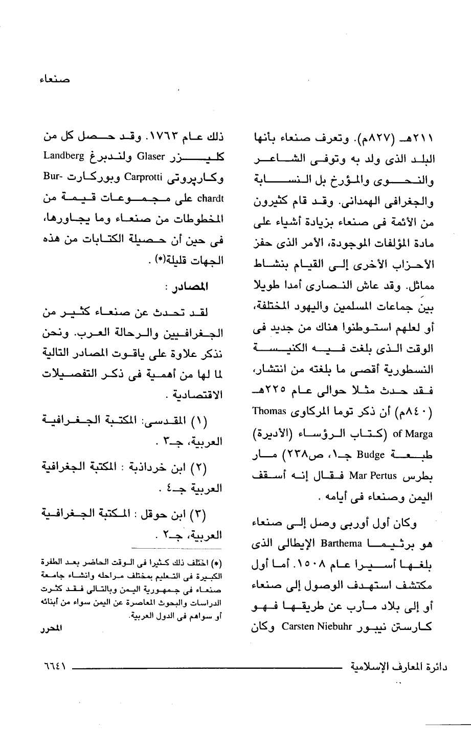 211 هـ (827 م). وتعرف صنعاء بأنها البلد الذى ولد به وتوفى الشاعر والنحوى والمؤرخ بل النسابة والجغرافى الهمدانى. وقد قام كثيرون من الأئمة فى صنعاء بزيادة أشياء على مادة المؤلفات الموجودة، الأمر الذى حفز الأحزاب الأخرى إلى القيام بنشاط مماثل. وقد عاش النصارى أمدا طويلًا بين جماعات المسلمين واليهود المختلفة، أو لعلهم استوطنوا هناك من جديد فى الوقت الذى بلغت فيه الكنيسة النسطورية أقصى ما بلغته من انتشار، فقد حدث مثلا حوالى عام 225 هـ (840 م) أن ذكر توما المركاوى Thomas of Marga (كتاب الرؤساء (الأديرة) طبعة Budge جـ 1، ص 238) مار بطرس Mar Pertus فقال إنه أسقف اليمن وصنعاء فى أيامه.