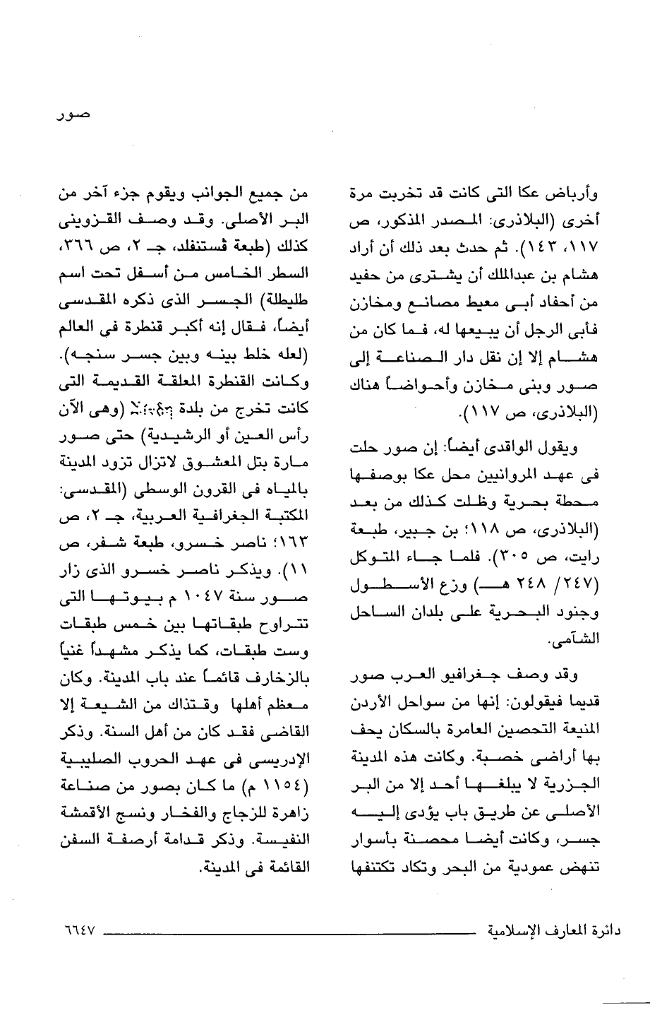 وقد وصف جغرافيو العرب صور قديما فيقولون: إنها من سواحل الأردن المنيعة التحصين العامرة بالسكان يحف بها أراضى خصبة. وكانت هذه المدينة الجزرية لا يبلغها أحد إلا من البر الأصلى عن طريق باب يؤدى إليه جسر، وكانت أيضًا محصنة بأسوار تنهض عمودية من البحر وتكاد تكتنفها من جميع الجوانب ويقوم جزء آخر من البر الأصلى. وقد وصف القزوينى كذلك (طبعة فستنفلد، جـ 2، ص 366, السطر الخامس من أسفل تحت اسم طليطلة) الجسر الذى ذكره المقدسى أيضًا، فقال إنه أكبر قنطرة فى العالم (لعله خلط بينه وبين جسر سنجه). وكانت القنطرة المعلقة القديمة التى كانت تخرج من بلدة (وهى الآن رأس العين أو الرشيدية) حتى صور مارة بتل المعشوق لا تزال تزود المدينة بالمياه فى القرون الوسطى (المقدسى: المكتبة الجغرافية العربية، جـ 2، ص 163؛ ناصر خسرو، طبعة شفر، ص 11). ويذكر ناصر خسرو الذى زار صور سنة 1047 م بيوتها التى تتراوح طبقاتها بين خمس طبقات وست طبقات، كما يذكر مشهد، غنيا بالزخارف قائما عند باب المدينة. وكان معظم أهلها وقتذاك من الشيعة إلا القاضى فقد كان من أهل السنة. وذكر الإدريسى فى عهد الحروب الصليبية (1154 م) ما كان بصور من صناعة زاهرة للزجاج والفخار ونسج الأقمشة النفيسة. وذكر قدامة أرصفة السفن القائمة فى المدينة.