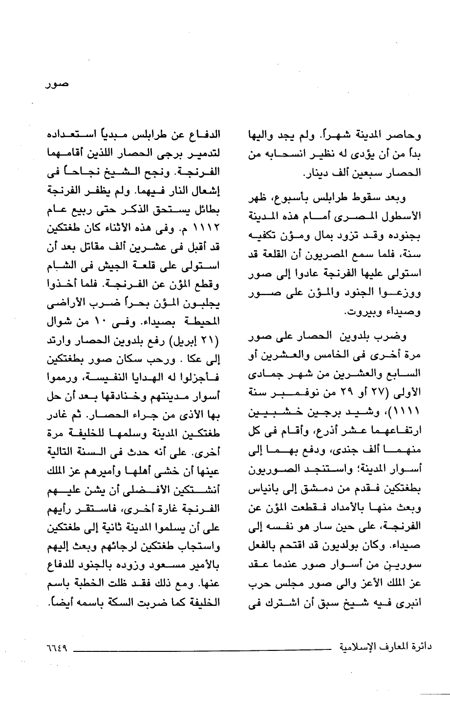 وضرب بلدوين الحصار على صور مرة أخرى فى الخامس والعشرين أو السابع والعشرين من شهر جمادى الأولى (27 أو 29 من نوفمبر سنة 1111)، وشيد برجين خشبيين ارتفاعهما عشر أذرع، وأقام فى كل منهما ألف جندى، ودفع بهما إلى أسوار المدينة؛ واستنجد الصوريون بطغتكين فقدم من دمشق إلى بانياس وبعث منها بالأمداد فقطعت المؤن عن الفرنجة، على حين سار هو نفسه إلى صيداء. وكان بولديون قد اقتحم بالفعل سورين من أسوار صور عندما عقد عز الملك الأعز وإلى صور مجلس حرب انبرى فيه شيخ سبق أن اشترك فى الدفاع عن طرابلس مبديًا استعداده لتدمير برجى الحصار اللذين أقامهما الفرنجة. ونجح الشيخ نجاحًا فى إشعال النار فيهما. ولم يظفر الفرنجة بطائل يستحق الذكر حتى ربيع عام 1112 م. وفى هذه الأثناء كان طغتكين قد أقبل فى عشرين ألف مقاتل بعد أن استولى على قلعة الجيش فى الشام وقطع المؤن عن الفرنجة. فلما أخذوا يجلبون المؤن بحرًا ضرب الأراضى المحيطة بصيداء. وفى 10 من شوال (21 إبريل) رفع بلدوين الحصار وارتد إلى عكا. ورحب سكان صور بطغتكين فأجزلوا له الهدايا النفيسة، ورمموا أسوار مدينتهم وخنادقها بعد أن حل بها الأذى من جراء الحصار. ثم غادر طغتكين المدينة وسلمها للخليفة مرة أخرى. على أنه حدث فى السنة التالية عينها أن خشى أهلها وأميرهم عز الملك أنشتكين الأفضلى أن يشن عليهم الفرنجة غارة أخرى، فاستقر رأيهم على أن يسلموا المدينة ثانية إلى طغتكين واستجاب طغتكين لرجائهم وبعث إليهم بالأمير مسعود وزوده بالجنود للدفاع عنها. ومع ذلك فقد ظلت الخطبة باسم الخليفة كما ضربت السكة باسمه أيضًا.