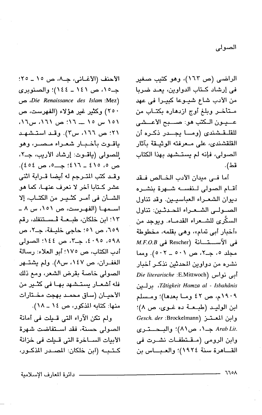 الراضى (ص 163)، وهو كتيب صغير فى إرشاد كتاب الدواوين، يعد ضربا من الأدب شاع شيوعا كبيرا فى عهد متأخر وبلغ أوج ازدهاره بكتاب من عيون الكتب هو: صبح الأعشى للقلقشندى (وما يجدر ذكره أن القلقشندى، على معرفته الوثيقة بآثار الصولى، فإنه لم يستشهد بهذا الكتاب قط).