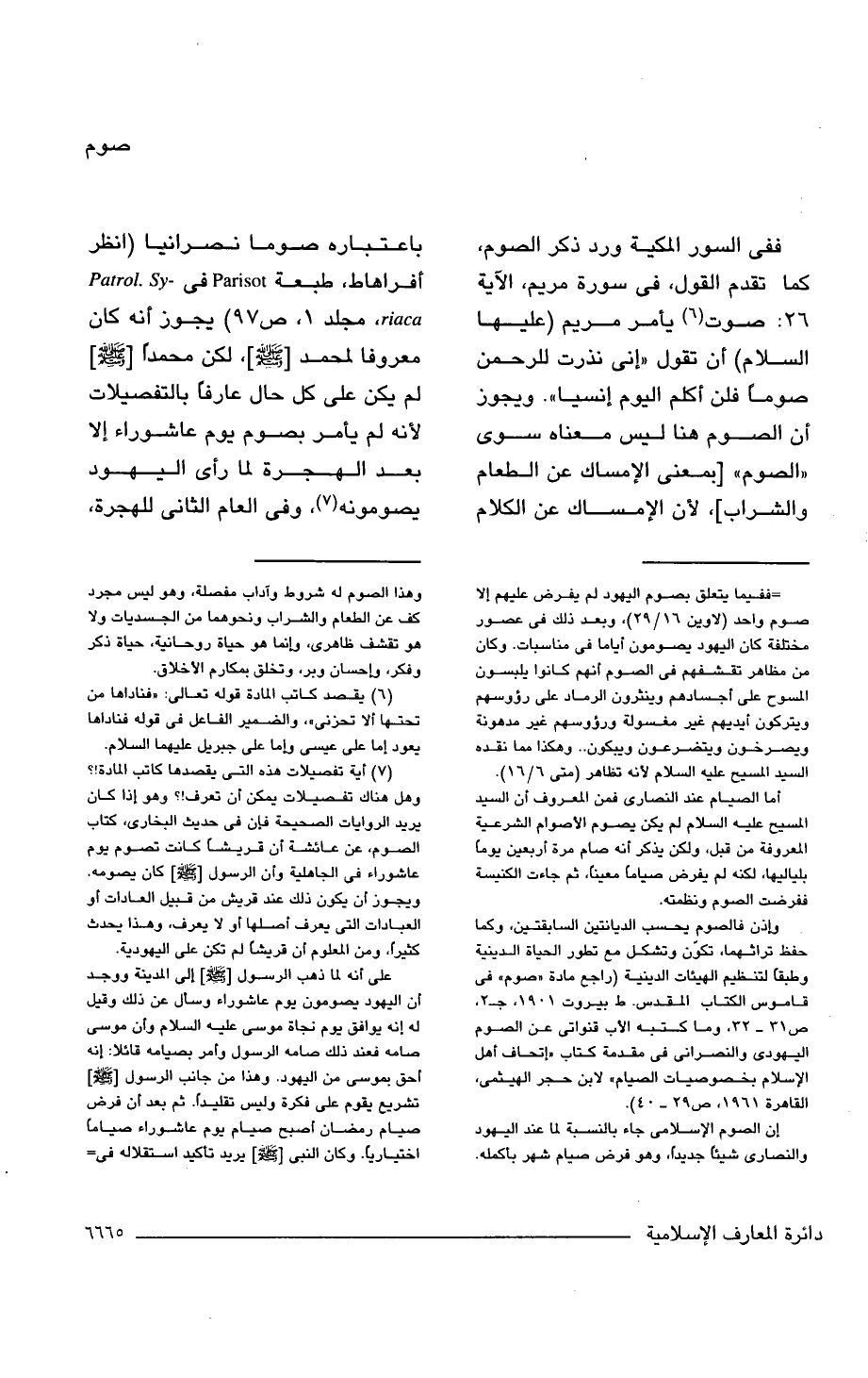 ففى السور المكية ورد ذكر الصوم، كما تقدم القول، فى سورة مريم، الآية 26: صوت (¬6) يأمر مريم (عليها السلام) أن تقول {إِنِّي نَذَرْتُ لِلرَّحْمَنِ صَوْمًا فَلَنْ أُكَلِّمَ الْيَوْمَ إِنْسِيًّا}. ويجوز أن الصوم هنا ليس معناه سوى "الصوم" [بمعنى الإمساك عن الطعام والشراب]؛ لأن الإمساك عن الكلام باعتباره صومًا نصرانيا (انظر أفراهاط، طبعة Parisot فى patrol. Syriaca، مجلد 1, ص 97) يجوز أنه كان معروفا لمحمد [-صلى اللَّه عليه وسلم-] لكن محمدًا [-صلى اللَّه عليه وسلم-] لم يكن على كل حال عارفًا بالتفصيلات لأنه لم يأمر بصوم يوم عاشوراء إلا بعد الهجرة لما رأى اليهود يصومونه (¬7)، وفى العام الثانى للهجرة،