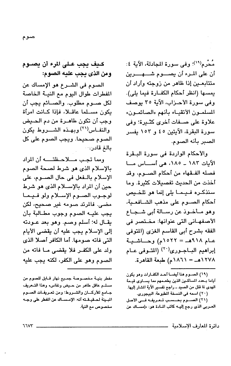مُحْرم (¬19)؛ وفى سورة المجادلة، الآية 4: أن على المرء أن يصوم شهرين متتابعين إذا ظاهر من زوجته وأراد أن يمسها (انظر أحكام الكفارة فيما يلى). وفى سورة الأحزاب، الآية 35 يوصف المسلمون الأتقياء بأنهم "الصائمون" علاوة على صفات أخرى كثيرة؛ وفى سورة البقرة، الآيتين 45 و 153 يفسر الصبر بأنه الصوم.