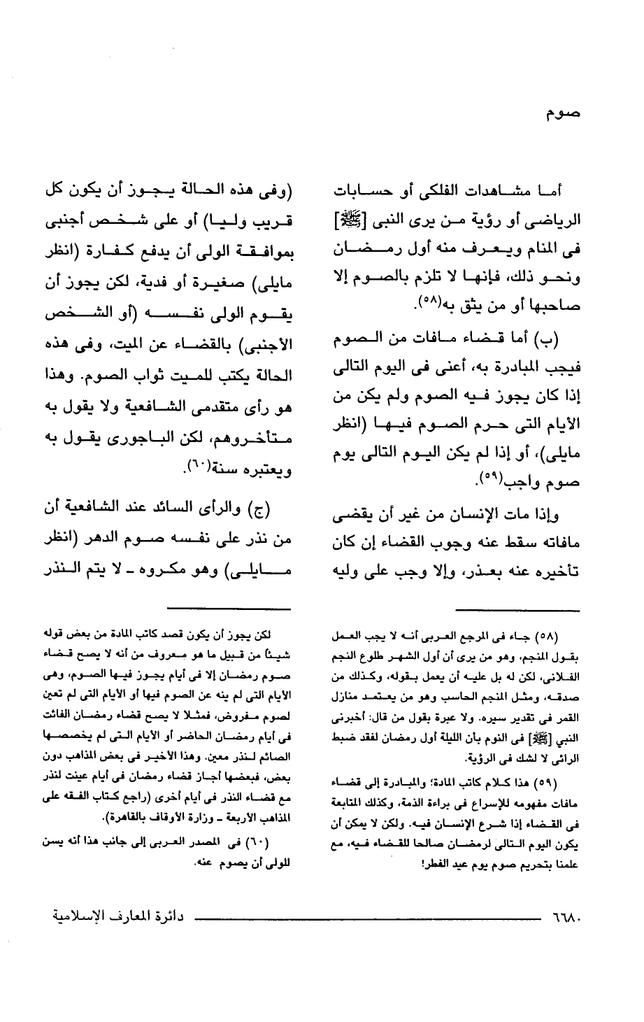 (¬58) جاء فى المرجع العربى أنه لا يجب العمل يقول المنجم, وهو من يرى أن أول الشهر طلوع النجم الفلانى، لكن له بل عليه أن يعمل بقوله، وكذلك من صدقه، ومثل المنجم الحاسب وهو من يعتمد منازل القمر فى تقدير سيره. ولا عبرة يقول من قال: أخبرنى النبى [-صلى اللَّه عليه وسلم-] فى النوم بأن الليلة أول رمضان لفقد ضبط الرائى لا لشك فى الرؤية.
