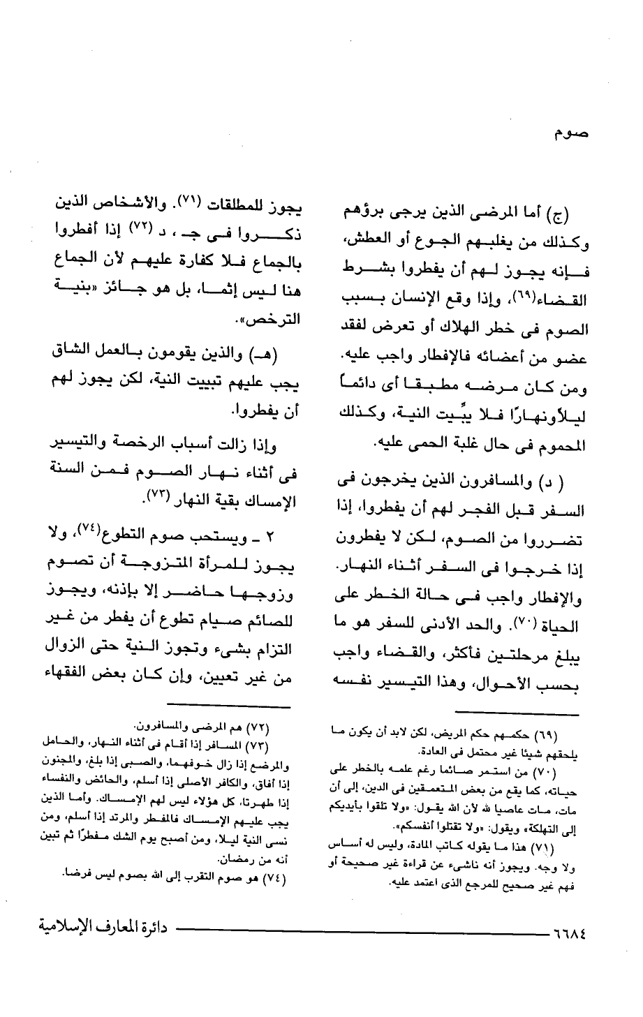 (د) والمسافرون الذين يخرجون فى السفر قبل الفجر لهم أن يفطروا، إذا تضرروا من الصوم، لكن لا يفطرون إذا خرجوا فى السفر أثناء النهار. والإفطار واجب فى حالة الخطر على الحياة (¬70). والحد الأدنى للسفر هو ما يبلغ مرحلتين فأكثر، والقضاء واجب بحسب الأحوال، وهذا التيسير نفسه يجوز للمطلقات (¬71). والأشخاص الذين ذكروا فى جـ، د (¬72) إذا أفطروا بالجماع فلا كفارة عليهم لأن الجماع هنا ليس إنّما، بل هو جائز "بنية الترخص".