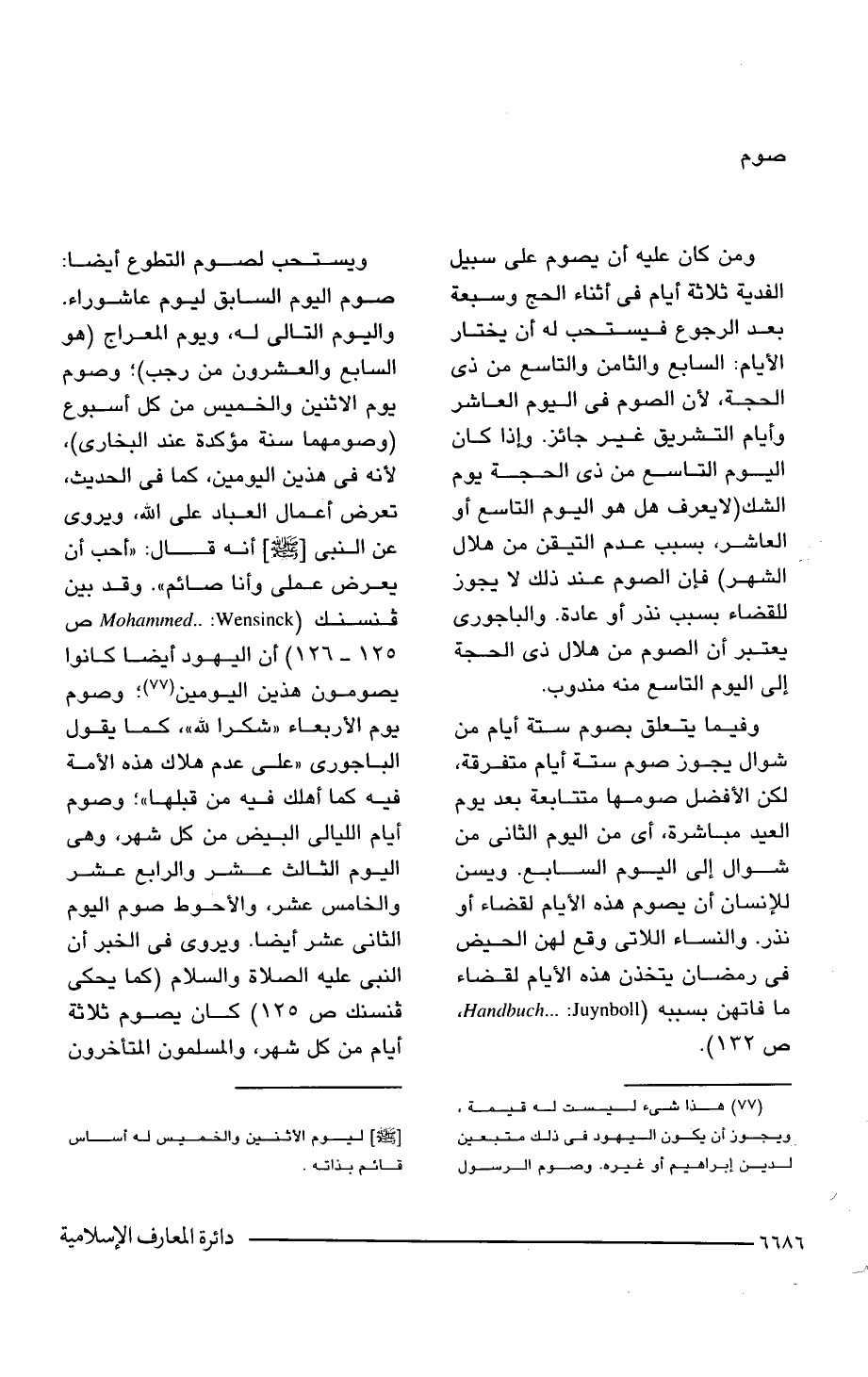 ويستحب لصوم التطوع أيضًا: صوم اليوم السابق ليوم عاشوراء. واليوم التالى له، ويوم المعراج (هو السابع والعشرون من رجب)؛ وصوم يوم الاثنين والخميس من كل أسبوع (وصومهما سنة مؤكدة عند البخارى)، لأنه فى هذين اليومين، كما فى الحديث، تعرض أعمال العباد على اللَّه، ويروى عن النبى [-صلى اللَّه عليه وسلم-] أنه قال: "أحب أن يعرض عملى وأنا صائم". وقد بين فنسنك (Mohammed . .: Wensinck ص 125 - 126) أن اليهود أيضًا كانوا يصومون هذين اليومين (¬77)؛ وصوم يوم الأربعاء "شكرا للَّه"، كما يقول الباجورى "على عدم هلاك هذه الأمة فيه كما أهلك فيه من قبلها"؛ وصوم أيام الليالى البيض من كل شهر، وهى اليوم الثالث عشر والرابع عشر والخامس عشر، والأحوط صوم اليوم الثانى عشر أيضًا. ويروى فى الخبر أن النبى عليه الصلاة والسلام (كما يحكى فنسنك ص 125) كان يصوم ثلاثة أيام من كل شهر، والمسلمون المتأخرون
