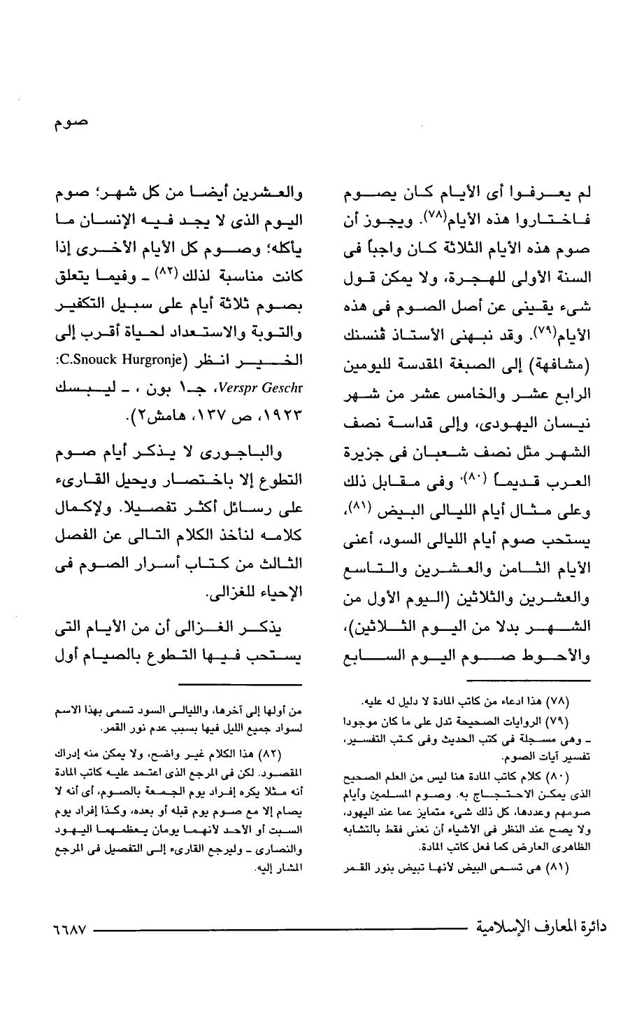 لم يعرفوا أى الأيام كان يصوم فاختاروا هذه الأيام (¬78). ويجوز أن صوم هذه الأيام الثلاثة كان واجبًا فى السنة الأولى للهجرة، ولا يمكن قول شئ يقينى عن أصل الصوم فى هذه الأيام (¬79). وقد نبهنى الأستاذ فنسنك (مشافهة) إلى الصبغة المقدسة لليومين الرابع عشر والخامس عشر من شهر نيسان اليهودى، وإلى قداسة نصف الشهر مثل نصف شعبان فى جزيرة العرب قديمًا (¬80)، وفى مقابل ذلك وعلى مثال أيام الليالى البيض (¬81)، يستحب صوم أيام الليالى السود، أعنى الأيام الثامن والعشرين والتاسع والعشرين والثلاثين (اليوم الأول من الشهر بدلا من اليوم الثلاثين)، والأحوط صوم اليوم السابع والعشرين أيضًا من كل شهر؛ صوم اليوم الذى لا يجد فيه الإنسان ما يأكله؛ وصوم كل الأيام الأخرى إذا كانت مناسبة لذلك (¬82) -وفيما يتعلق بصوم ثلاثة أيام على سبيل التكفير والتوبة والاستعداد لحياة أقرب إلى الخير انظر (Verspr Geschr: C.Snouck Hurgronje, جـ 1 بون، ليبسك 1923, ص 137, هامش 2).