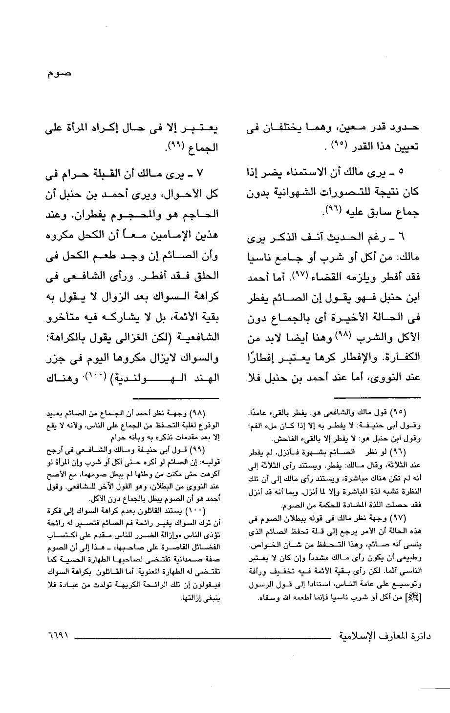 7 - يرى مالك أن القبلة حرام فى كل الأحوال، ويرى أحمد بن حنبل أن الحاجم هو والمحجوم يفطران. وعند هذين الإمامين معًا أن الكحل مكروه وأن الصائم إن وجد طعم الكحل فى الحلق فقد أفطر. ورأى الشافعى فى كراهة السواك بعد الزوال لا يقول به بقية الأئمة، بل لا يشاركه فيه متأخرو الشافعية (لكن الغزالى يقول بالكراهة؛ والسواك لا يزال مكروها اليوم فى جزر الهند الهولندية) (¬100) وهناك